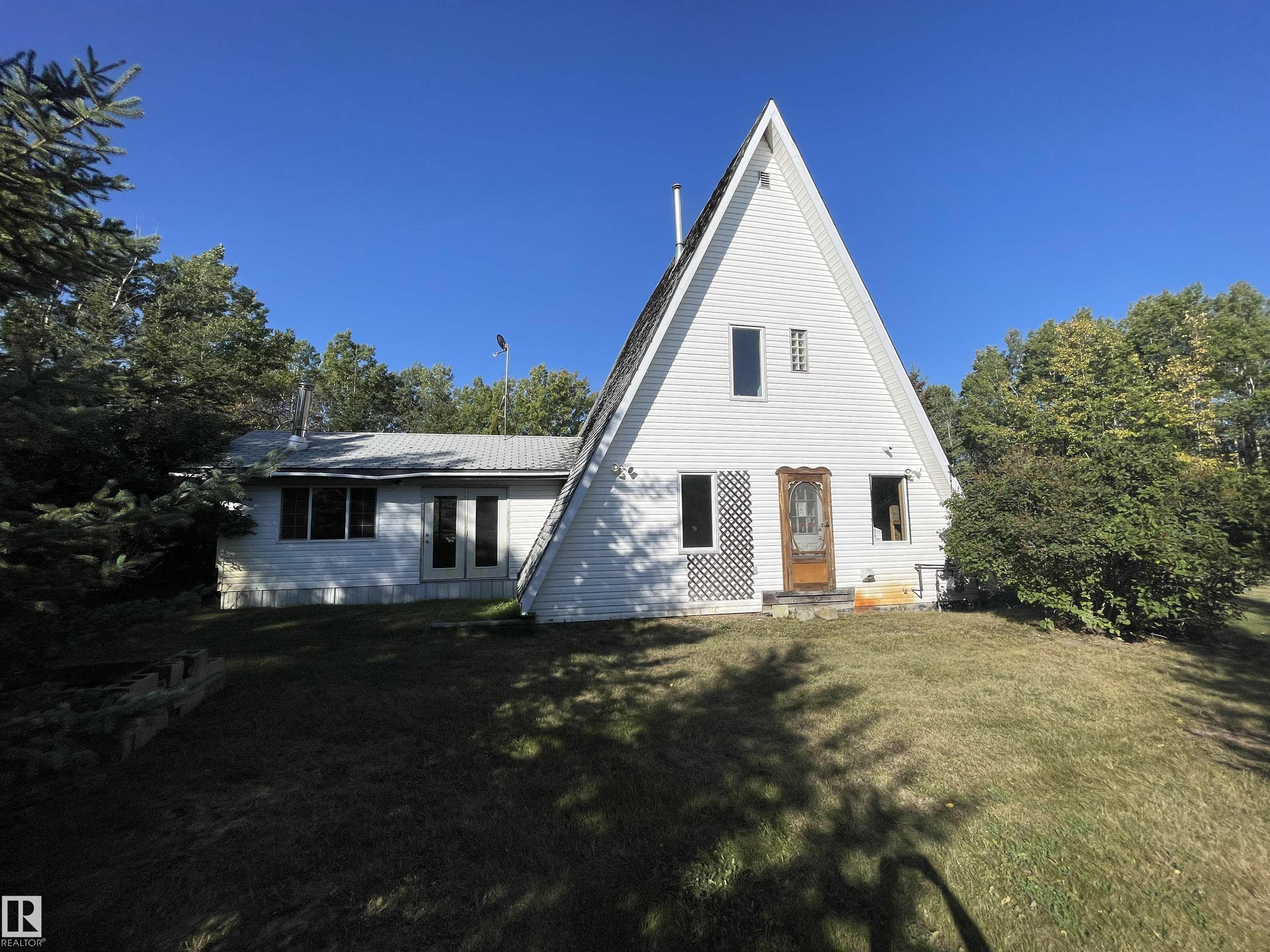 Located in the mature subdivision of Birch Grove on Moose lake, this unique A frame has 1280 sq. ft. of living space. This home features a cozy kitchen, dining area and large living room with a wood burning stove. Main floor laundry, 2 bedrooms and 2 baths. Off the living room are garden doors leading to 3 acres of peace and quiet. A 26' by 28' detached garage, garden area and fire pit to enjoy. Access to Moose lake for fishing, water skiing, or just relaxing. A great place to call home. Property is sold "AS IS" "WHERE IS".