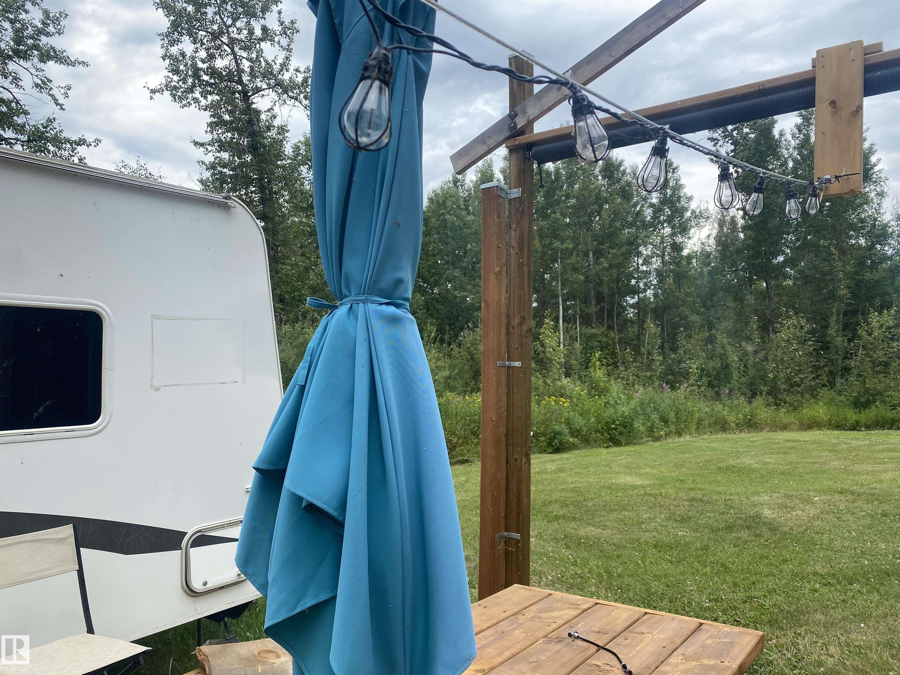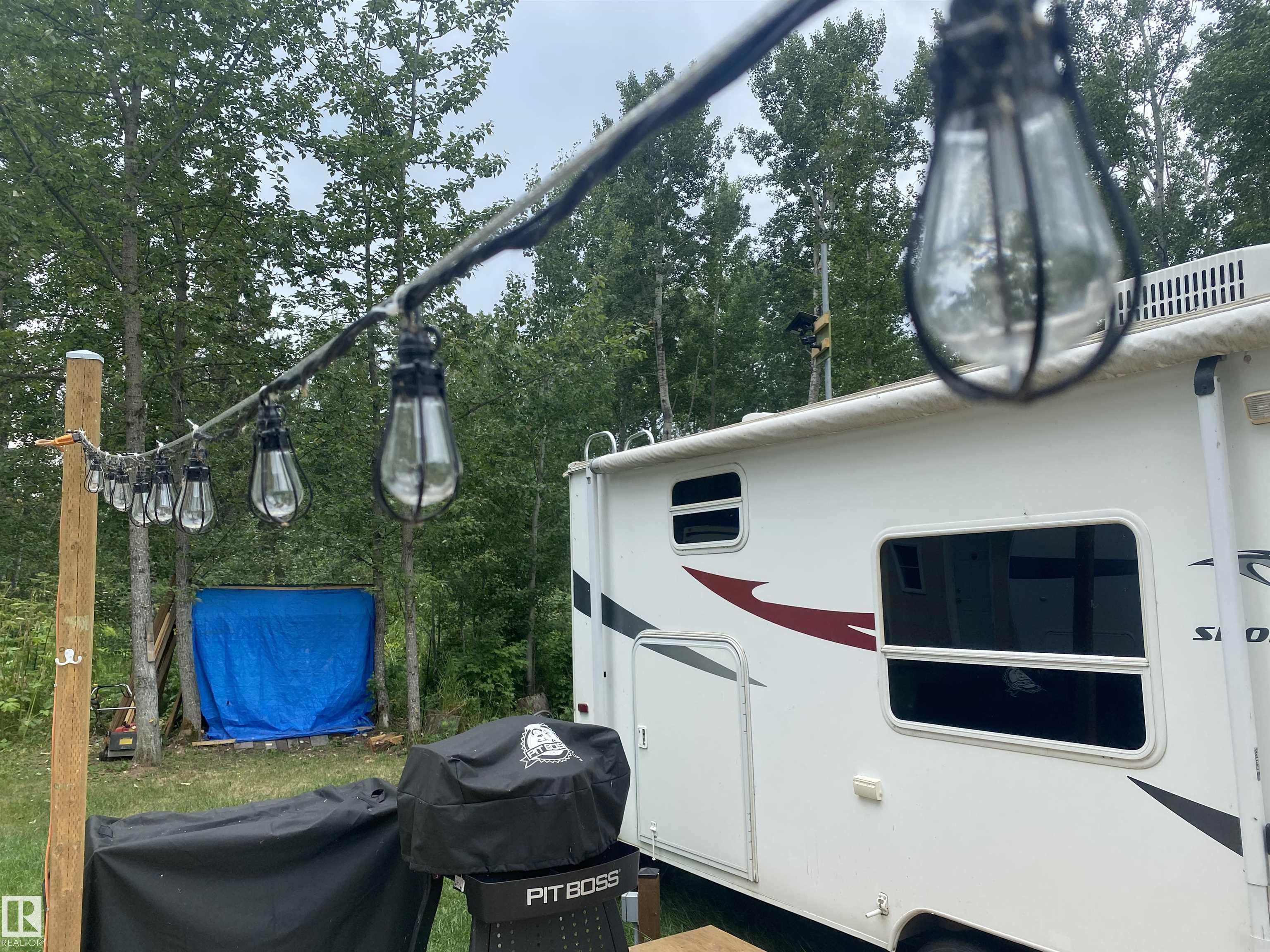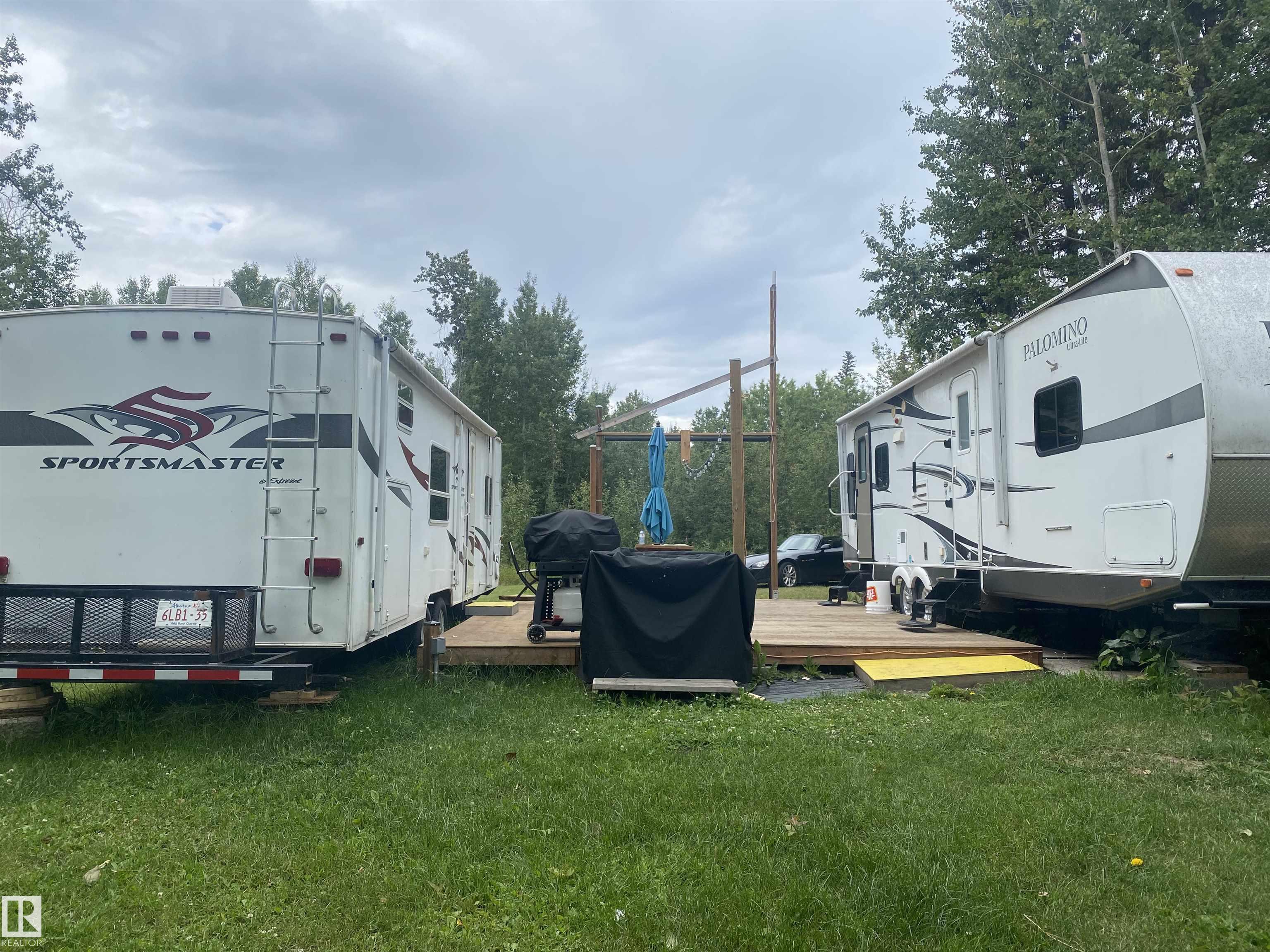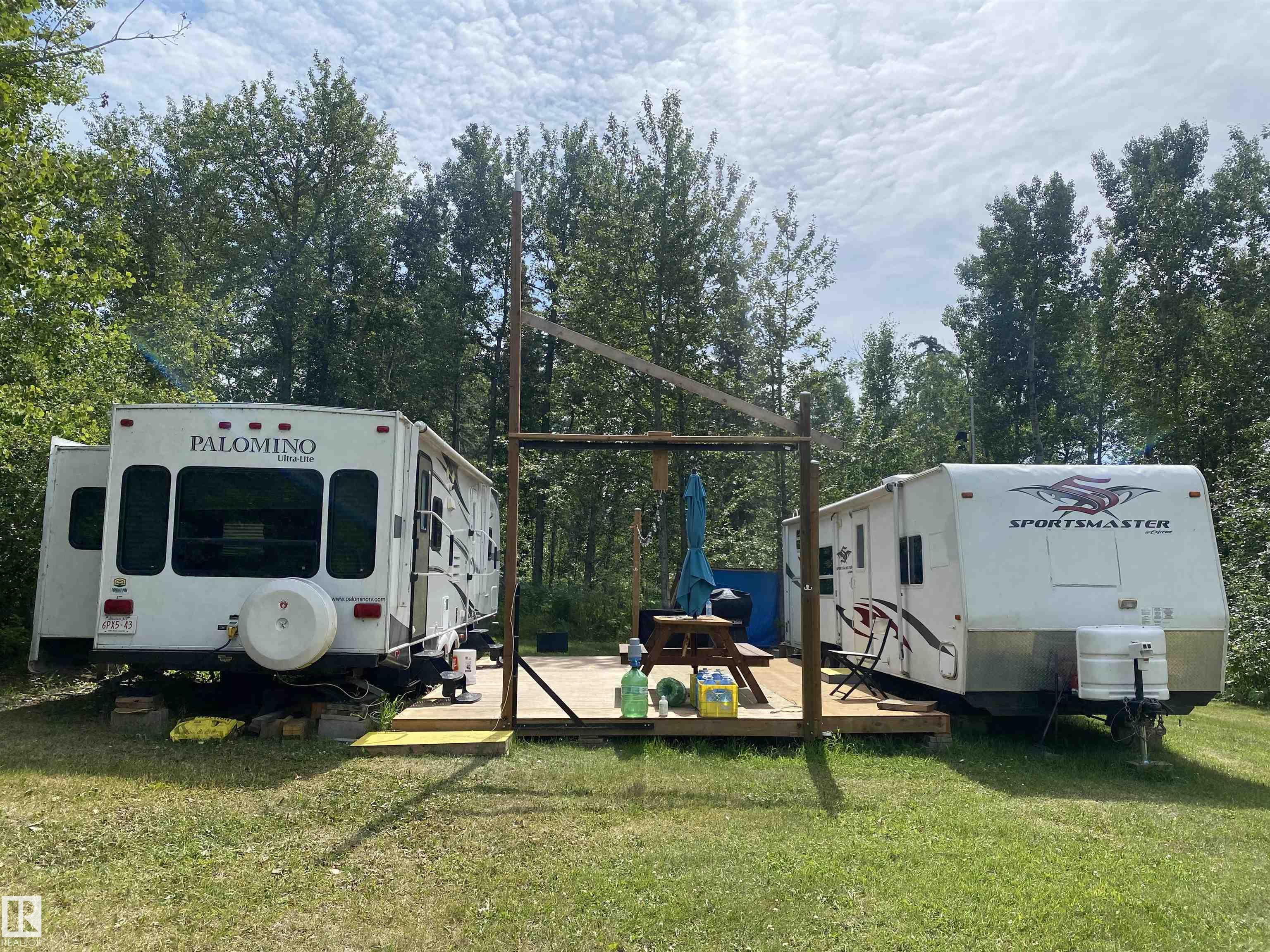 Bring your sleeping bags and start living this summer! Have you been DREAMING of your own private space to relax and wind down? This LAKE FRONT property is ready for you to build your dream home/cabin/cottage! Currently set up with 2 trailers & a 22x16 patio in between. Ability to sleep 8 comfortably and 12 with the tables down! Everything currently on site is INCLUDED! 2 travel trailers, an enclosed shower room with HWT and sink, sea-can for storage, water tank & trailer, dock with electric pontoon boat lift, cell phone range extender, riding lawnmower, BBQ, smokeless firepit and a short walking path with railings for safety and a bench to get to the lake! POWER is set up with 30AMP plugs to both trailers. This lot still has tons of space to set up games, tents or whatever you can dream up! Peace and serenity is calling, are you ready to answer?