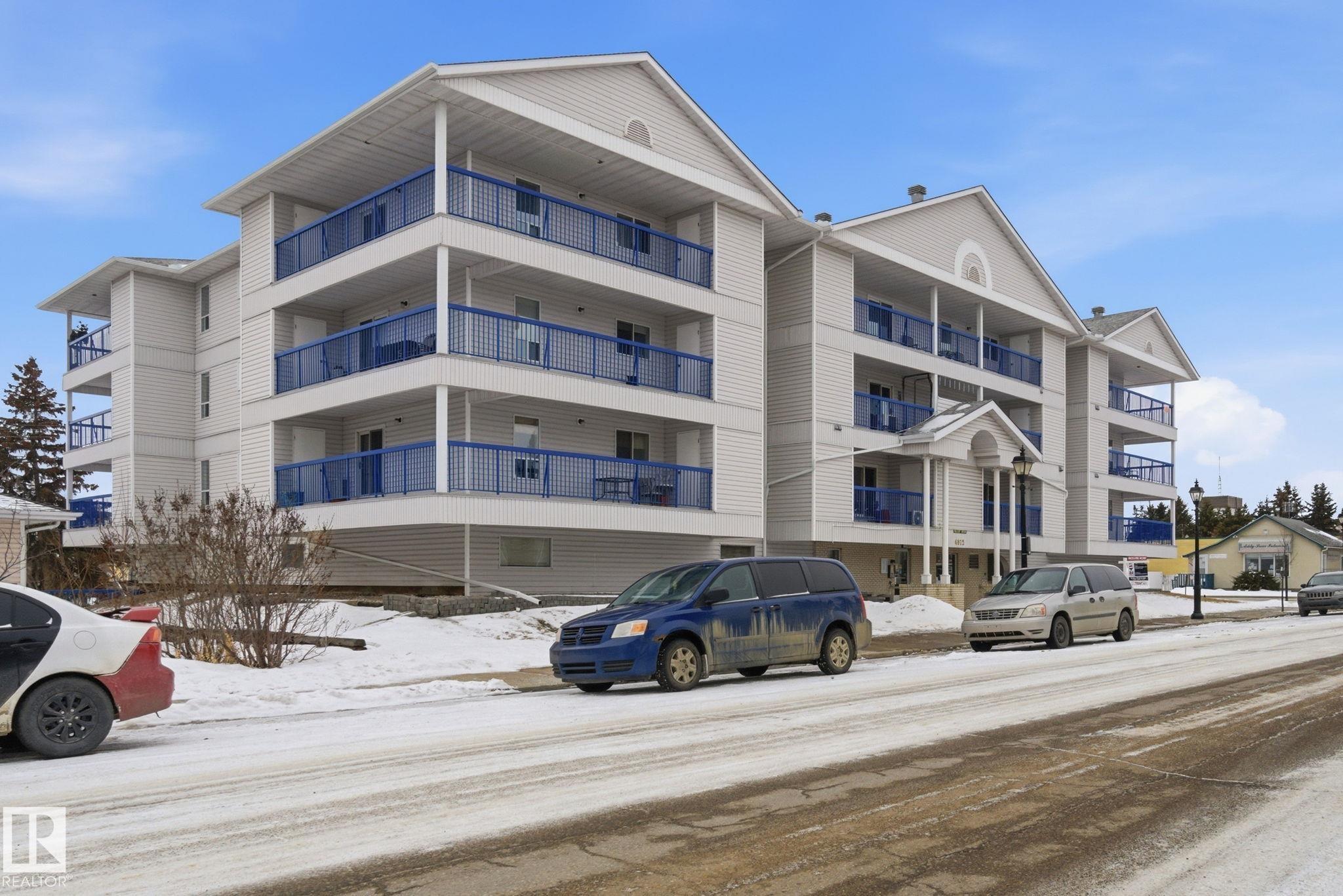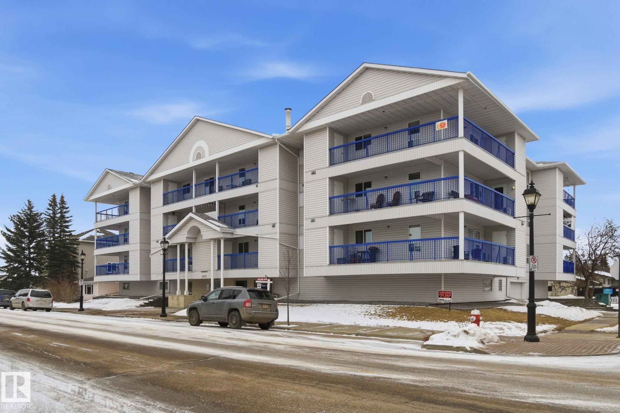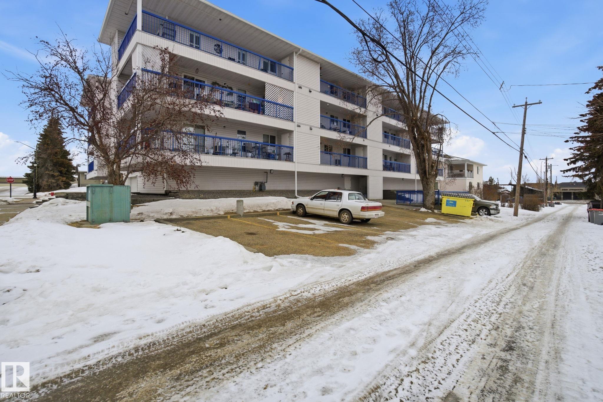 TOP FLOOR - CORNER UNIT 55+ adult living in this great 2 bedroom, 2 bathroom plus den unit in downtown Stony Plain! Feel at home as you walk in the door of this 1100 sq ft home. Very bright with natural light coming in from 2 sides. Kitchen is very functional with good prep space. Dining area is perfect for dinner at home but has room to host family too! Large living room is the perfect spot to watch your favourite show or chat with friends. The den makes a perfect spot to keep a home office or have a private spot to sit and read a book. Master bedroom has room for your furniture plus a walk in closet and 2pc ensuite. Guest bedroom is perfect for anyone from out of town. Additional 4pc bathroom too. Large laundry room has extra space for a freezer and storage in your unit. HUGE corner balcony wraps around with 2 additional storage rooms! Indoor heated parking to keep the snow off and an ADDITIONAL surface parking stall too right outside. Close to shopping, doctor, pharmacy and more!!!