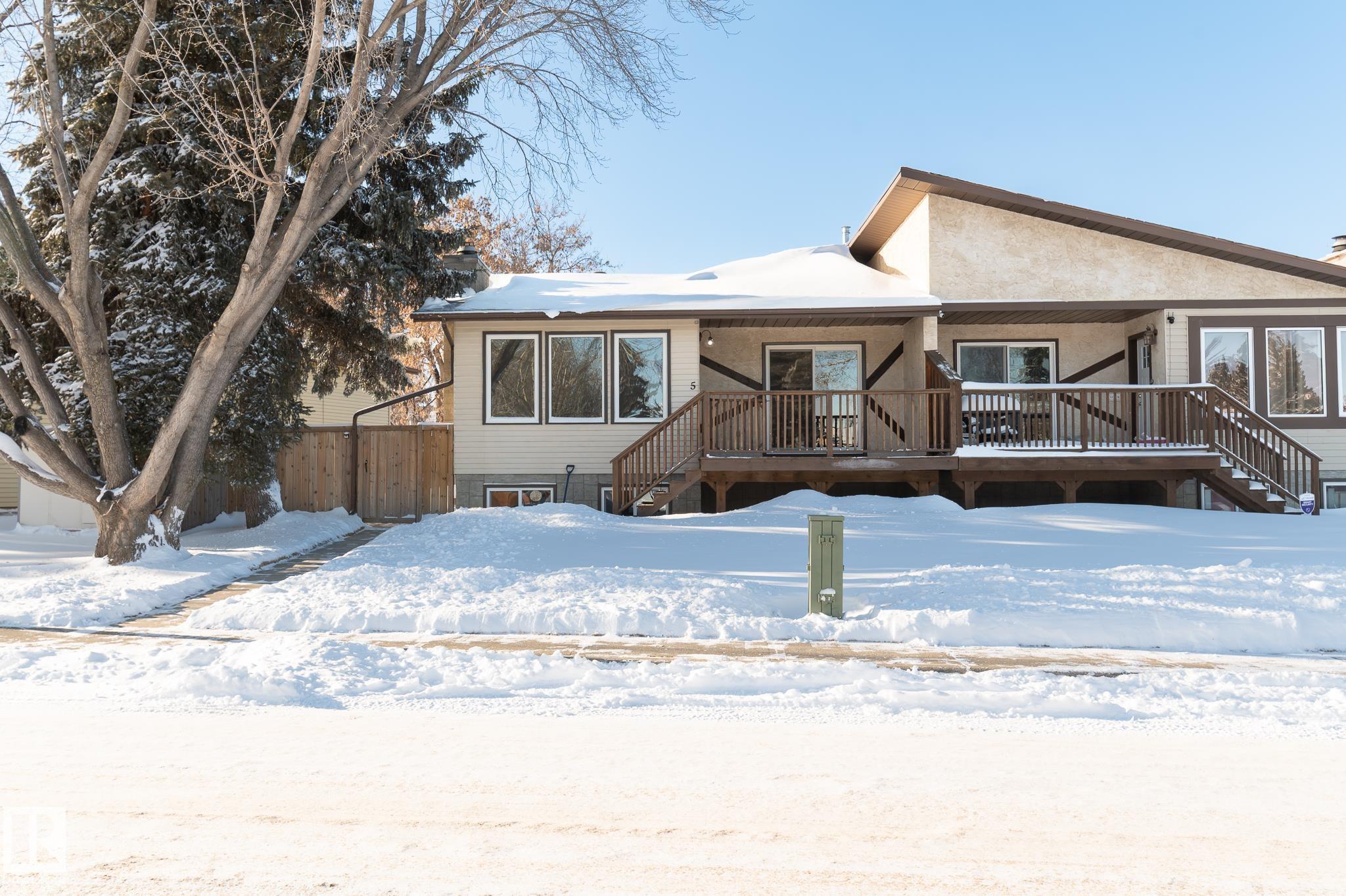 Nestled in the heart of Stony Plain this half duplex has been renovated and refreshed with new shingles, windows, doors, flooring, kitchen, bathrooms, landscaping and more. The main floor offers a bright open concept with a spacious living room flowing into the updated kitchen that features new brand name appliances and a generous eating area. Three large bedrooms and one and a half bathrooms complete the main level. The basement features a finished flex room/den space, while the remaining area is open for future development and includes a nearly new washer & dryer. The front entrance plus handy side entrance adds versatility for long-term possibilities. Outside the yard is fully fenced, features new landscaping and offers no direct front neighbours so you can enjoy mornings on the deck overlooking the creek. This home has quick access to Stony Plain's trail system, nearby playgrounds as well as an outdoor skate rink, skateboard park and BMX track, not to mention walking distance to schools and amenities.