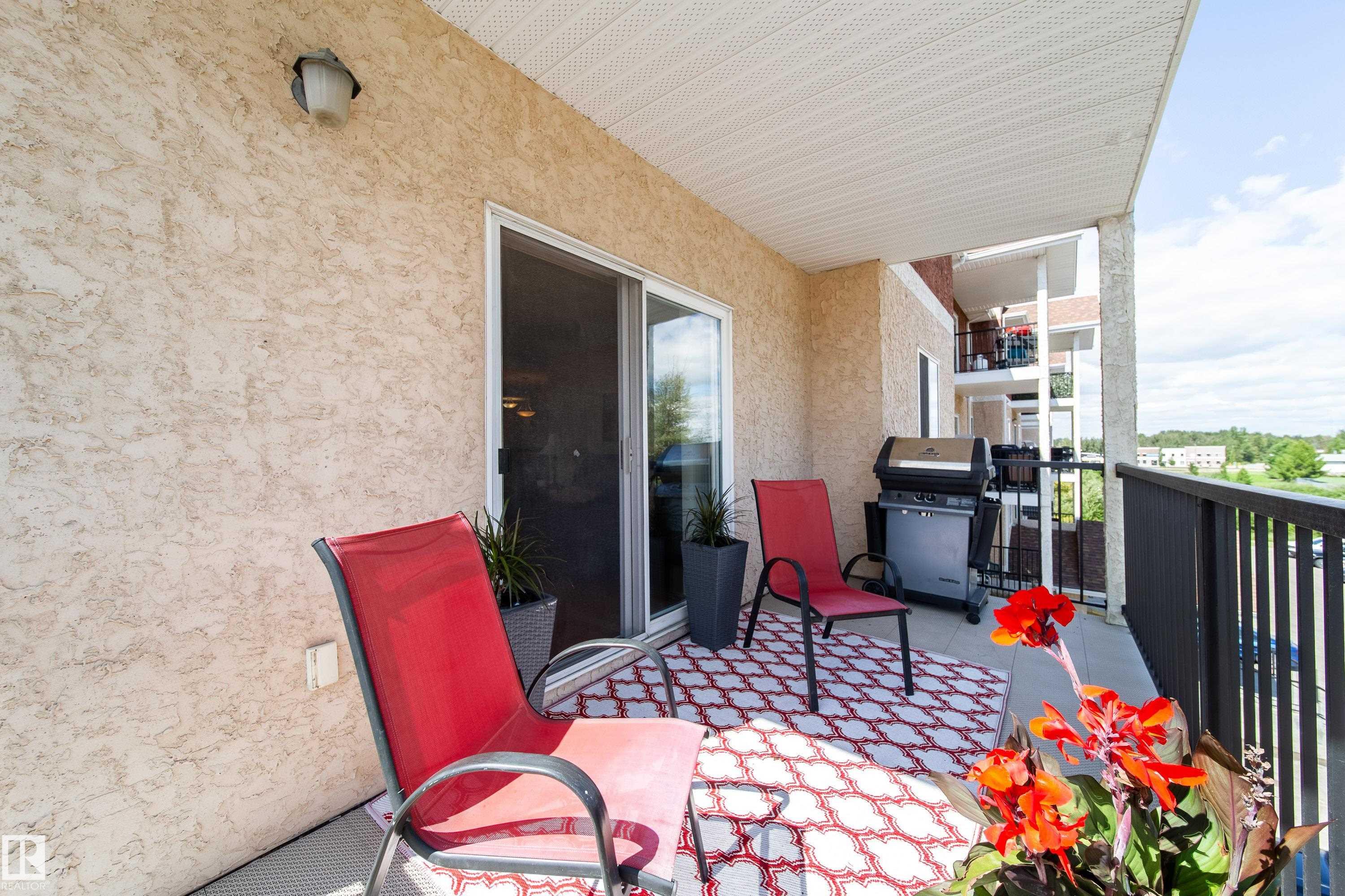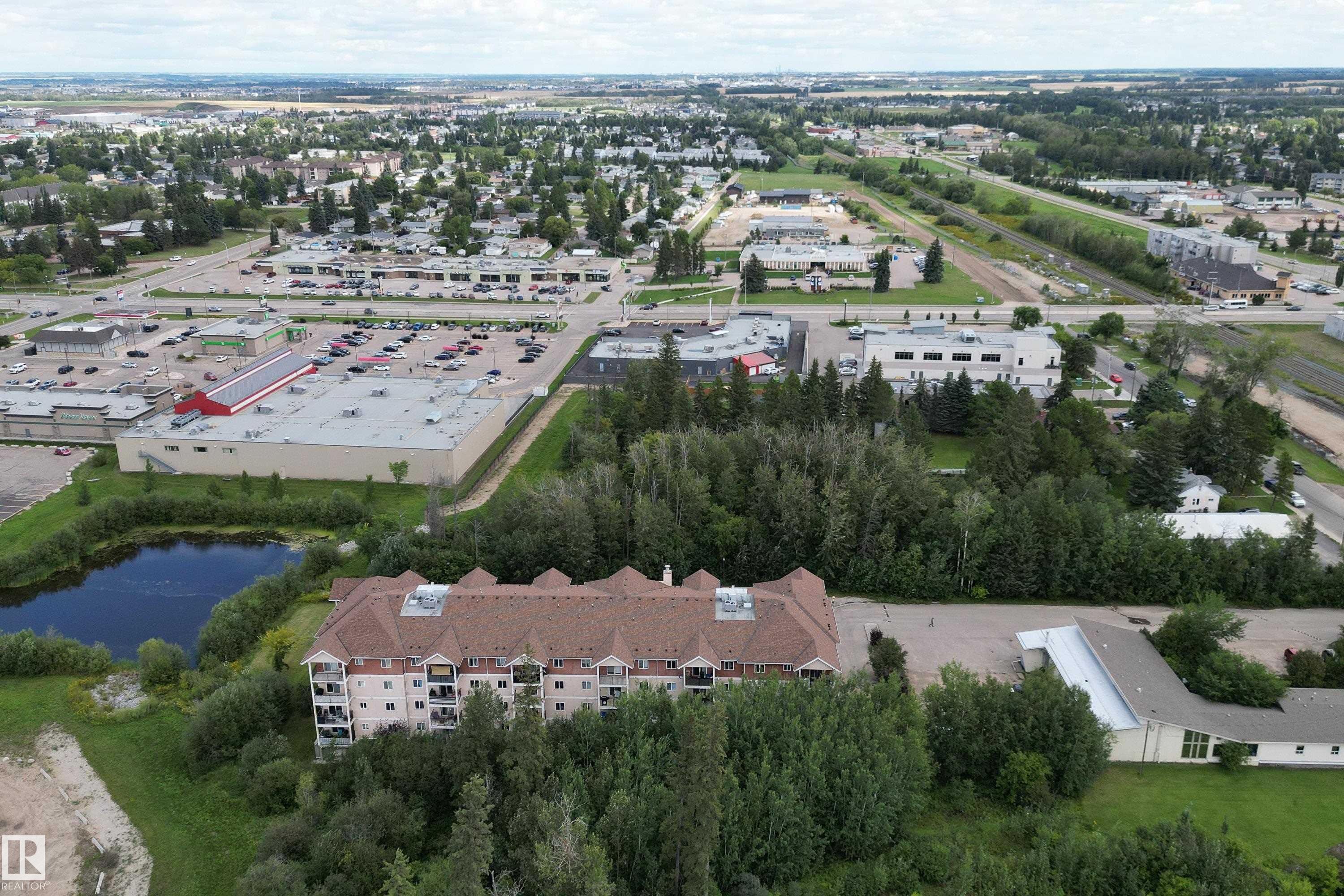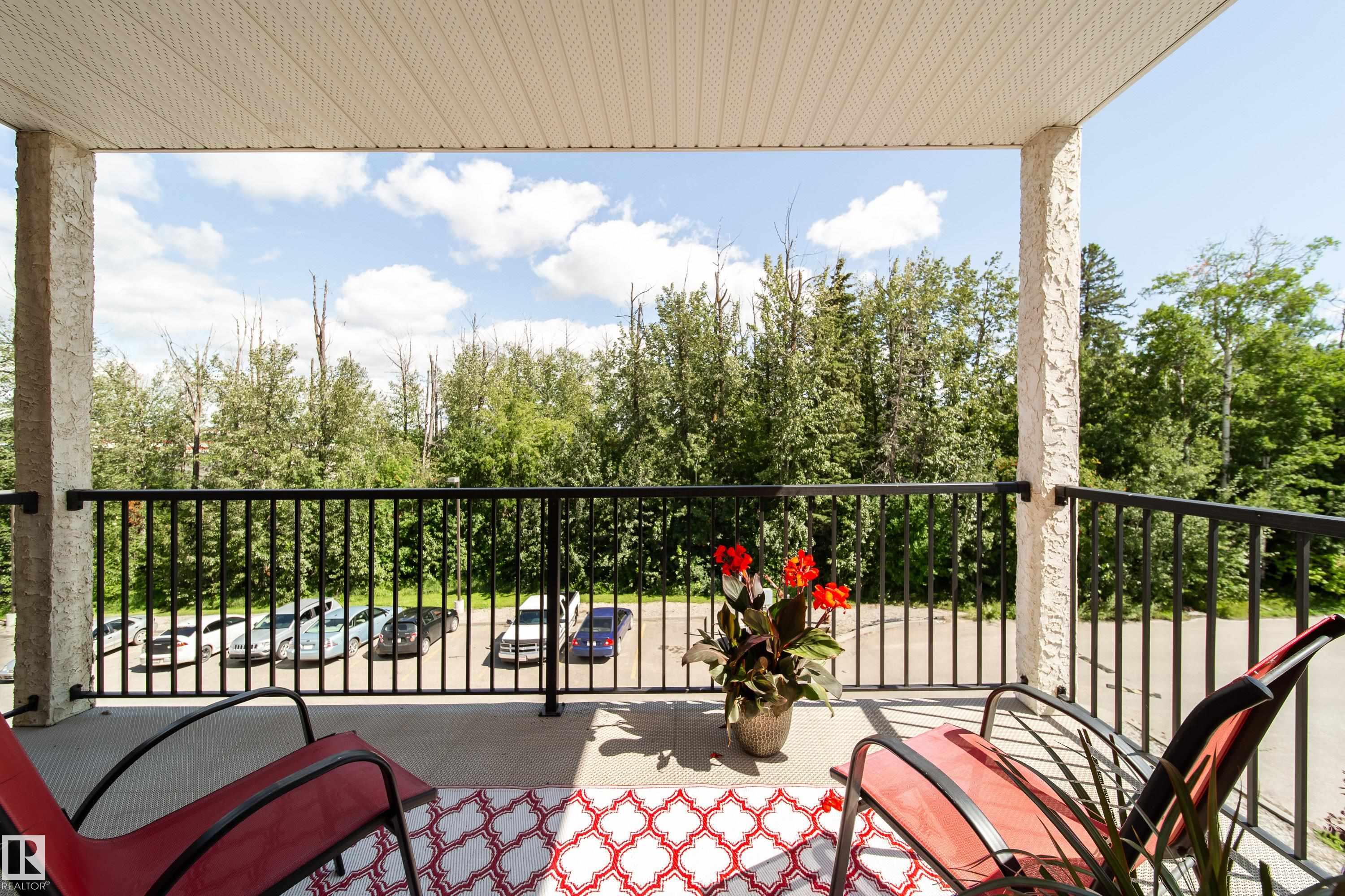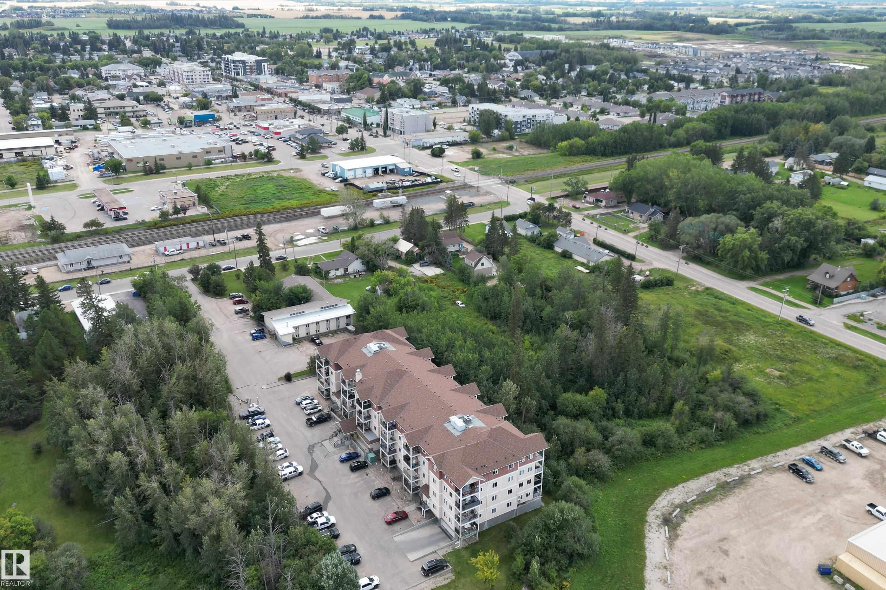 BRIGHT AND WELCOMING CORNER UNIT 2 bedroom, 2 bath condo is an absolute MUST SEE!! This lovely apartment style home is flooded with natural light and maximizes the square footage with a great, open-concept floor plan! Exceptional features include warm and elegant (newer) hardwood floors, large living room with east-facing balcony & beautiful treed views, well appointed kitchen with newer appliances, 2 generous-sized bedrooms, 2 FULL bathrooms, in-suite laundry, heated and secured underground parking, and secured mail delivery. This great condo is tucked away in a great location in Stony Plain - private and treed area with no-thru access road, NORTH of the train tracks (no waiting in train traffic jams!!), EASY walking distance to MAJOR grocery stores, pharmacies, restaurants, and all MAIN STREET has to offer, easy access to commuter roads and SO MUCH MORE! This value-price condo could be the PERFECT fit for your lifestyle.... an opportunity you won't want to miss!