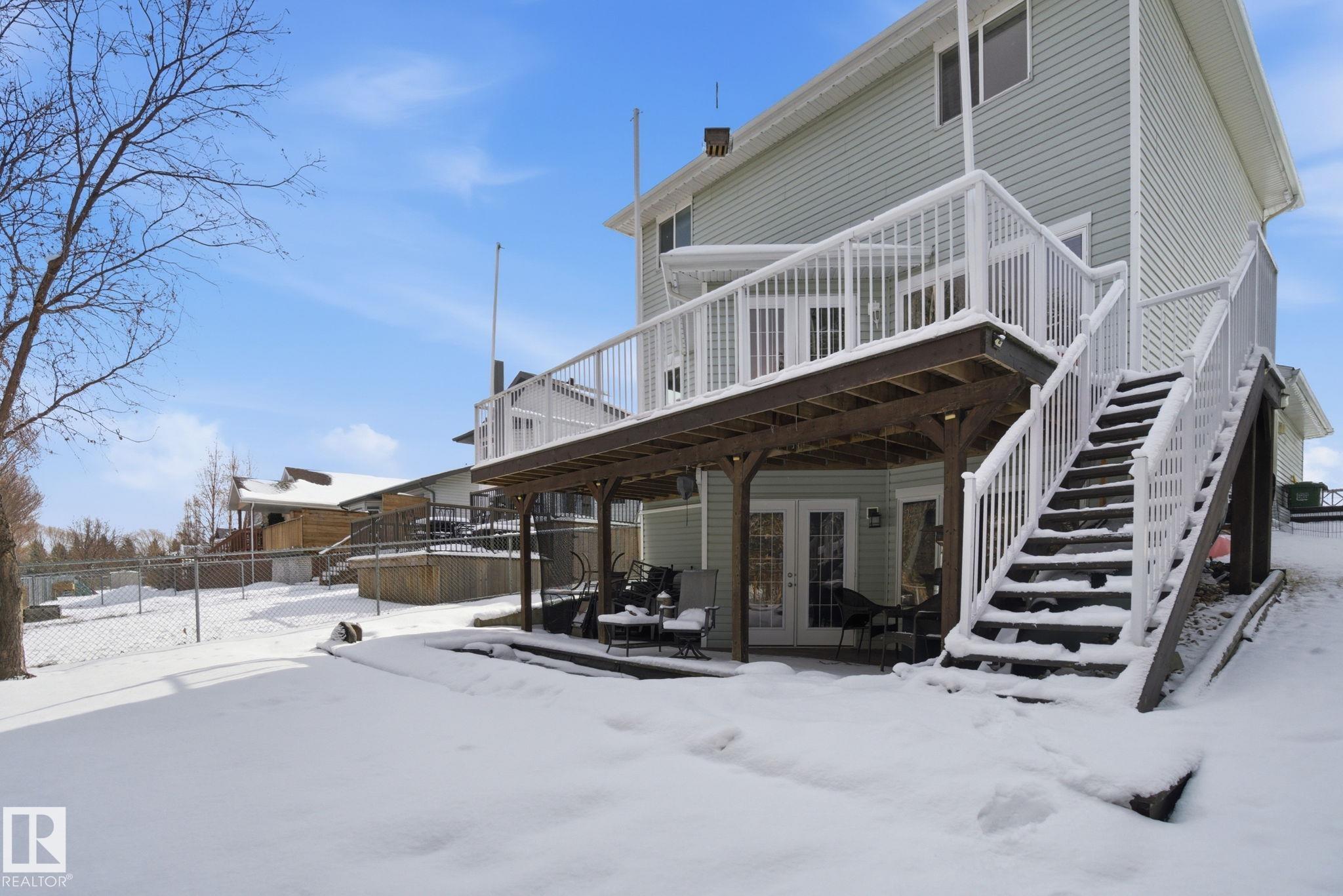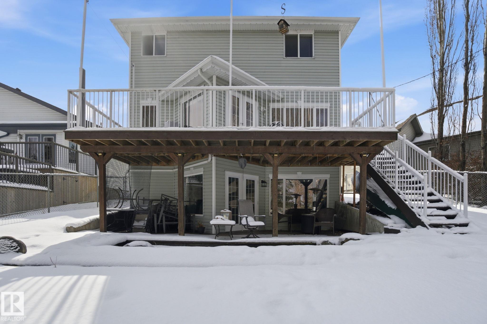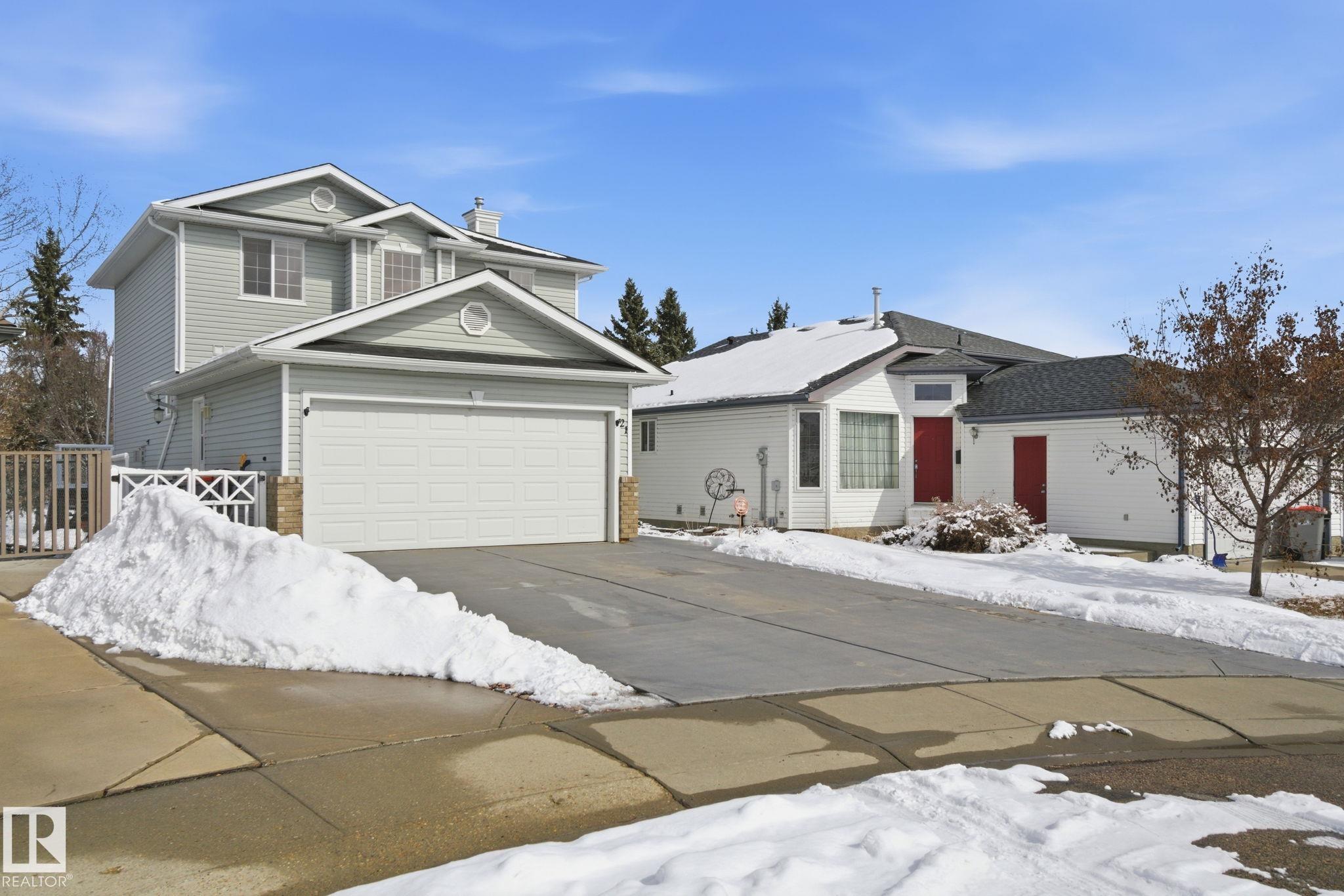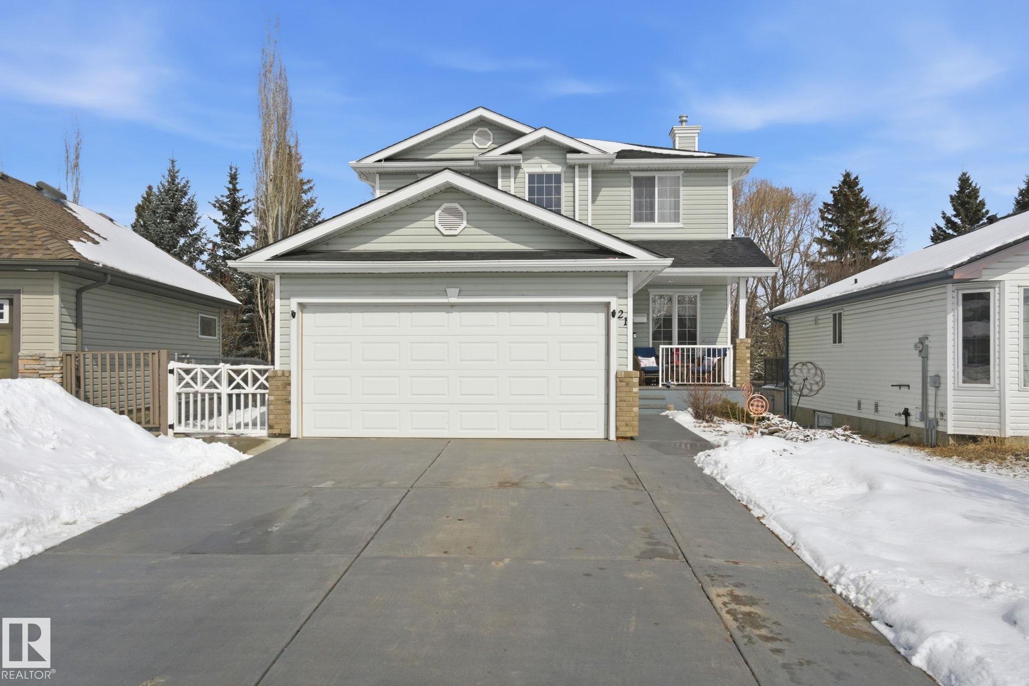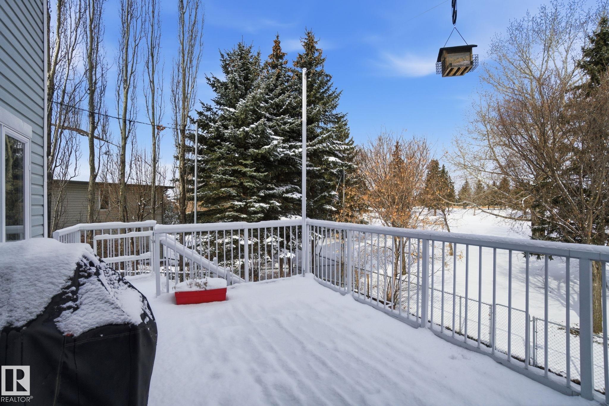 Beautiful WALKOUT 2-storey BACKING the GOLF COURSE in Stony Plain! Over 1500 sq ft PLUS fully finished basement. 18' ceilings greet you as you enter. Front flex room could be a great dining space, home office or formal living room. NEW kitchen is gorgeous with beautiful white cabinets, quartz countertops, corner pantry & updated appliances! Great breakfast nook with room to expand for guests! Large living room for more entertaining with gas fireplace. Tons of natural light through the windows looking onto the mature trees of the golf course. MAIN FLOOR LAUNDRY! Upstairs the master suite is a great size with large walk in closet and newly renovated 4pc ensuite. 2 more bedrooms are great for kids, guests or a home office. Walkout basement has large rec room space. It's even fully plumbed for wet bar or future 2nd kitchen. Another bedroom & 4pc bath. Large deck is great to spend a warm summer evening & yard is fully landscaped including picture, perfect Koi pond. It's your own private oasis!!!