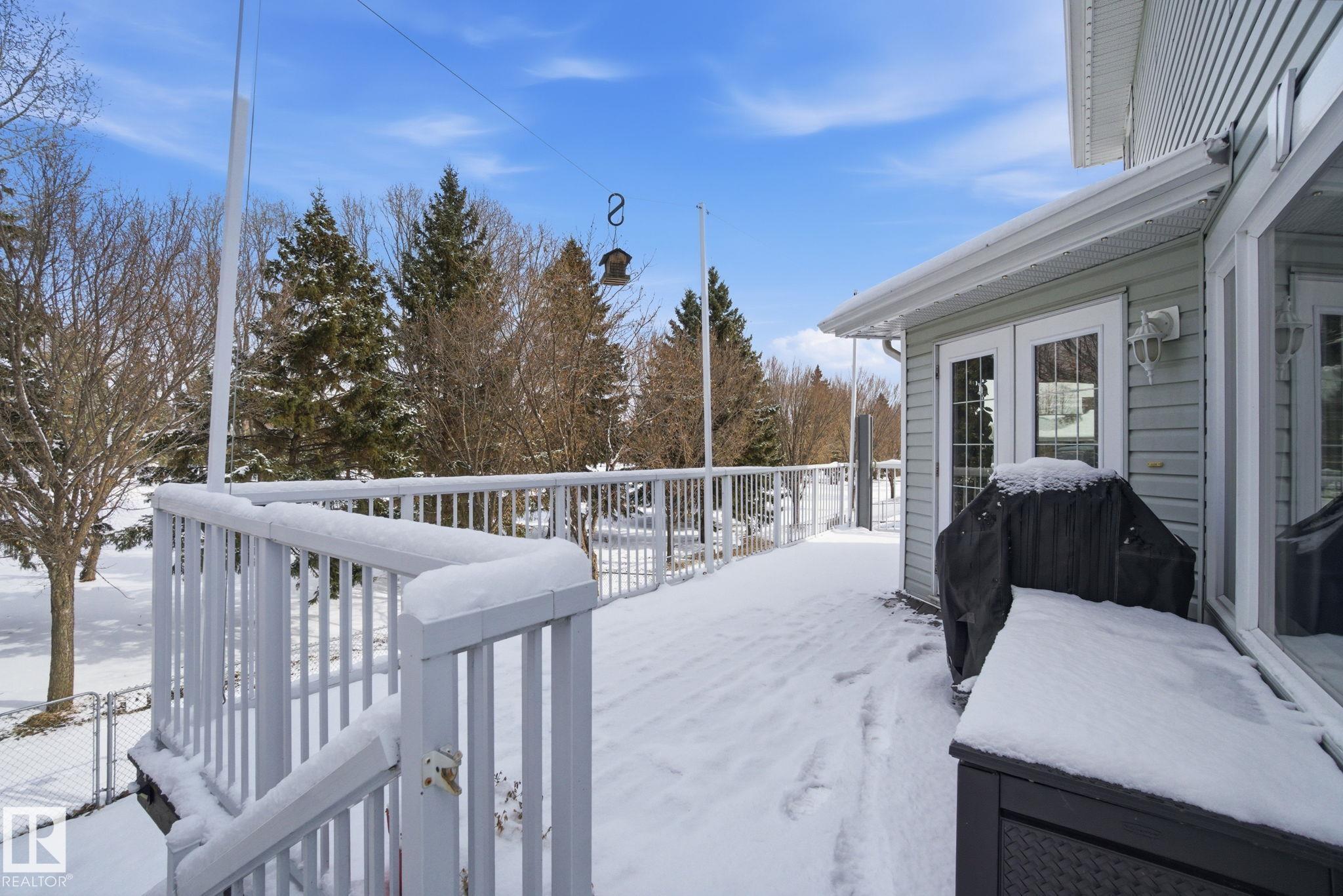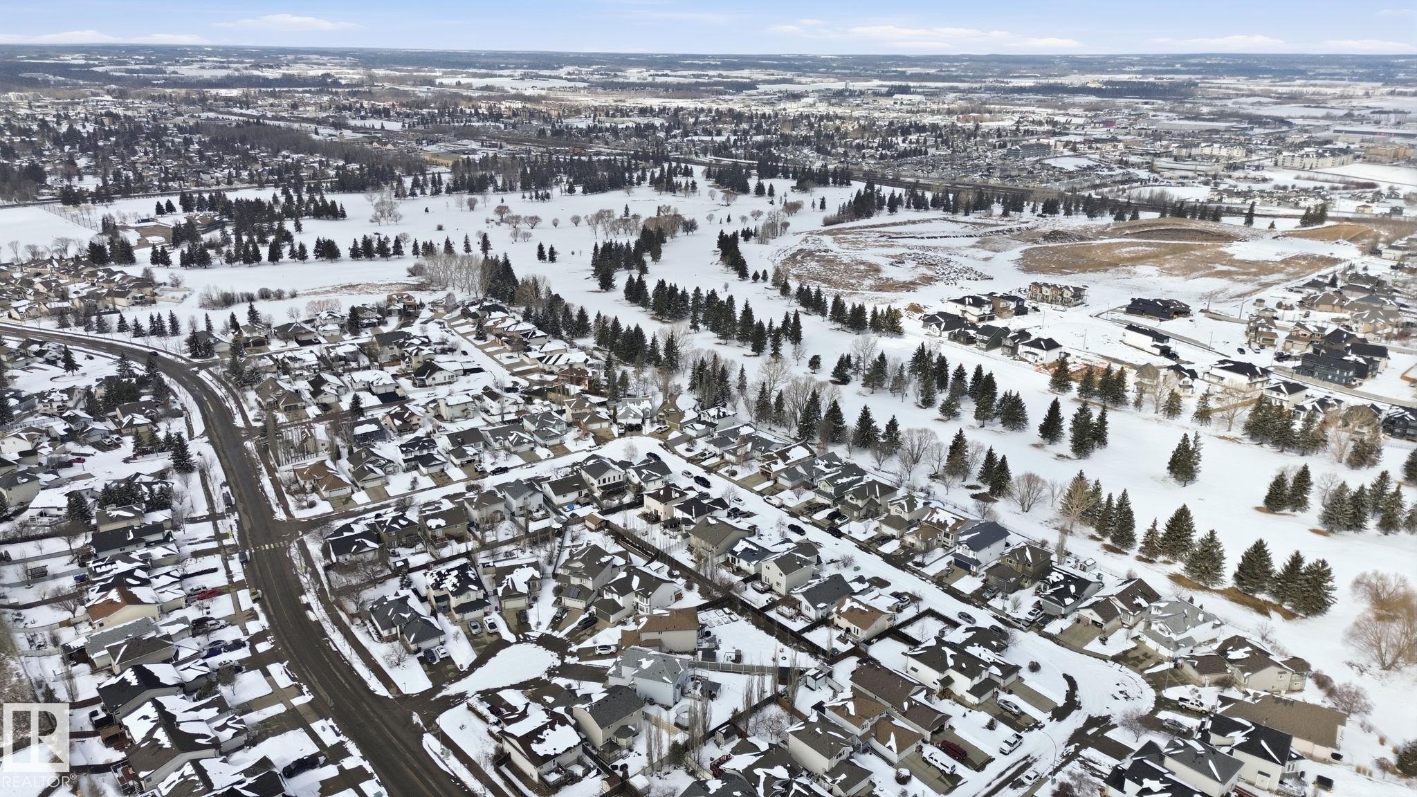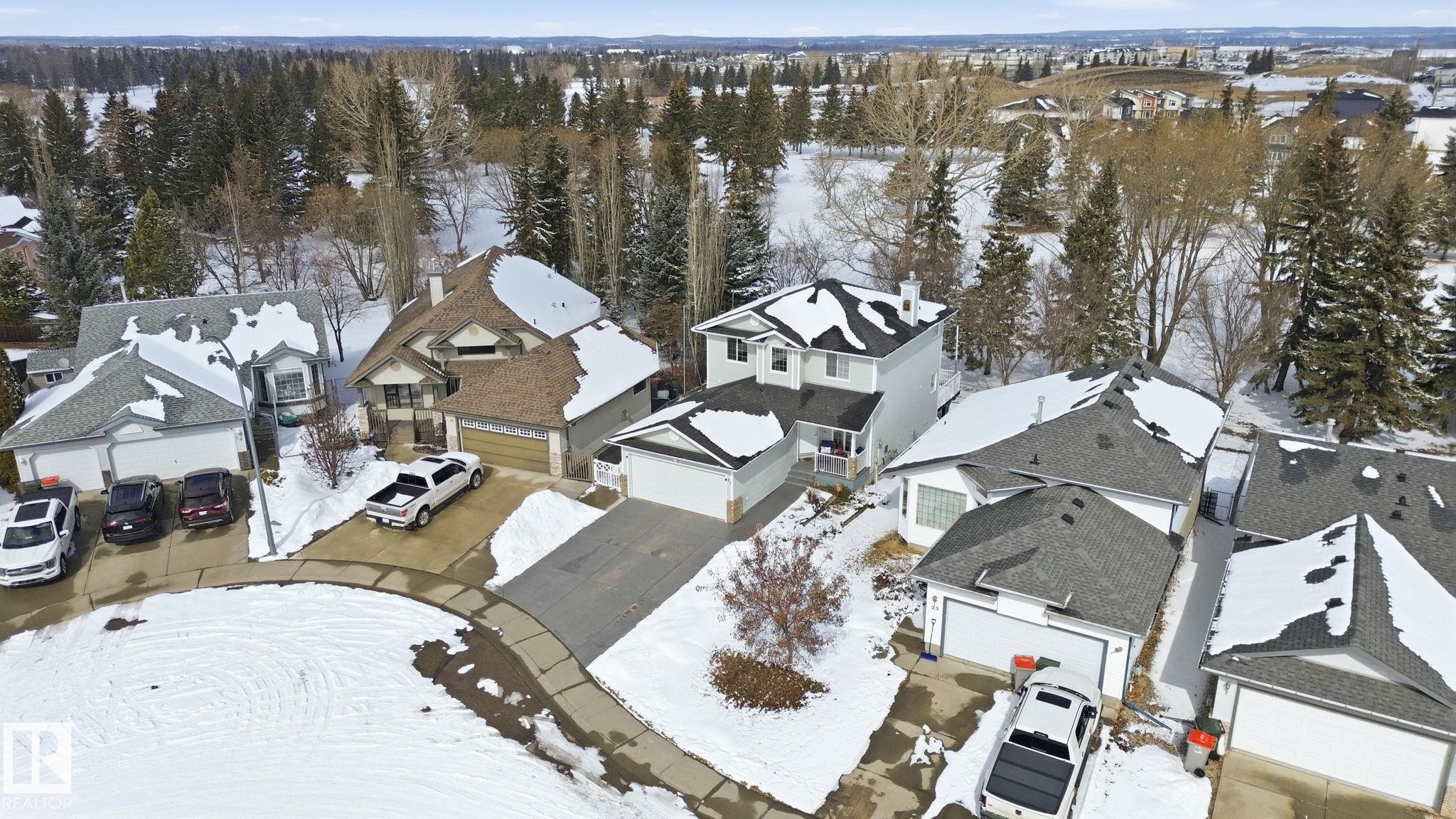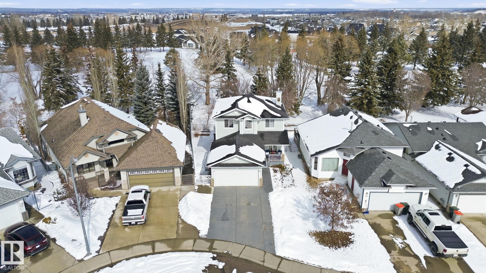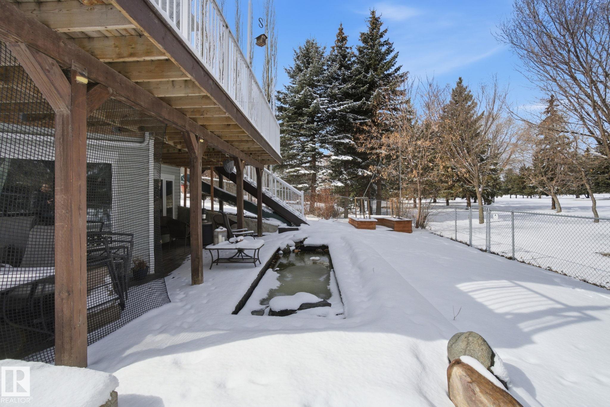 Beautiful WALKOUT 2-storey BACKING the GOLF COURSE in Stony Plain! Over 1500 sq ft PLUS fully finished basement. 18' ceilings greet you as you enter. Front flex room could be a great dining space, home office or formal living room. NEW kitchen is gorgeous with beautiful white cabinets, quartz countertops, corner pantry & updated appliances! Great breakfast nook with room to expand for guests! Large living room for more entertaining with gas fireplace. Tons of natural light through the windows looking onto the mature trees of the golf course. MAIN FLOOR LAUNDRY! Upstairs the master suite is a great size with large walk in closet and newly renovated 4pc ensuite. 2 more bedrooms are great for kids, guests or a home office. Walkout basement has large rec room space. It's even fully plumbed for wet bar or future 2nd kitchen. Another bedroom & 4pc bath. Large deck is great to spend a warm summer evening & yard is fully landscaped including picture, perfect Koi pond. It's your own private oasis!!!