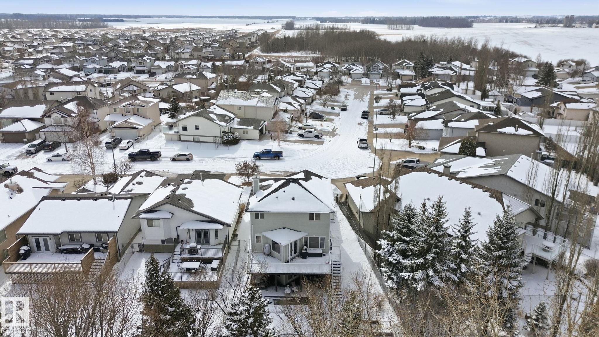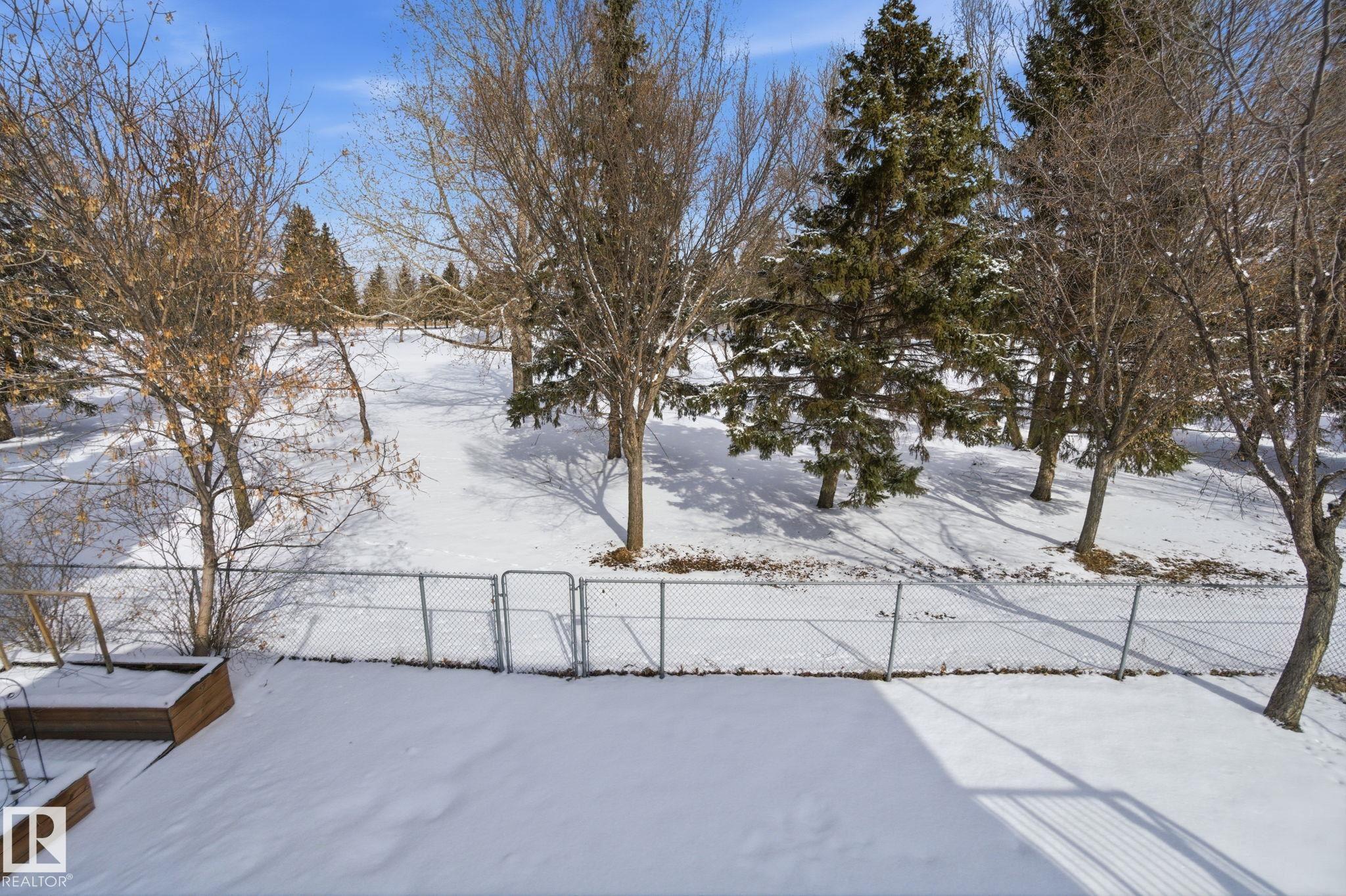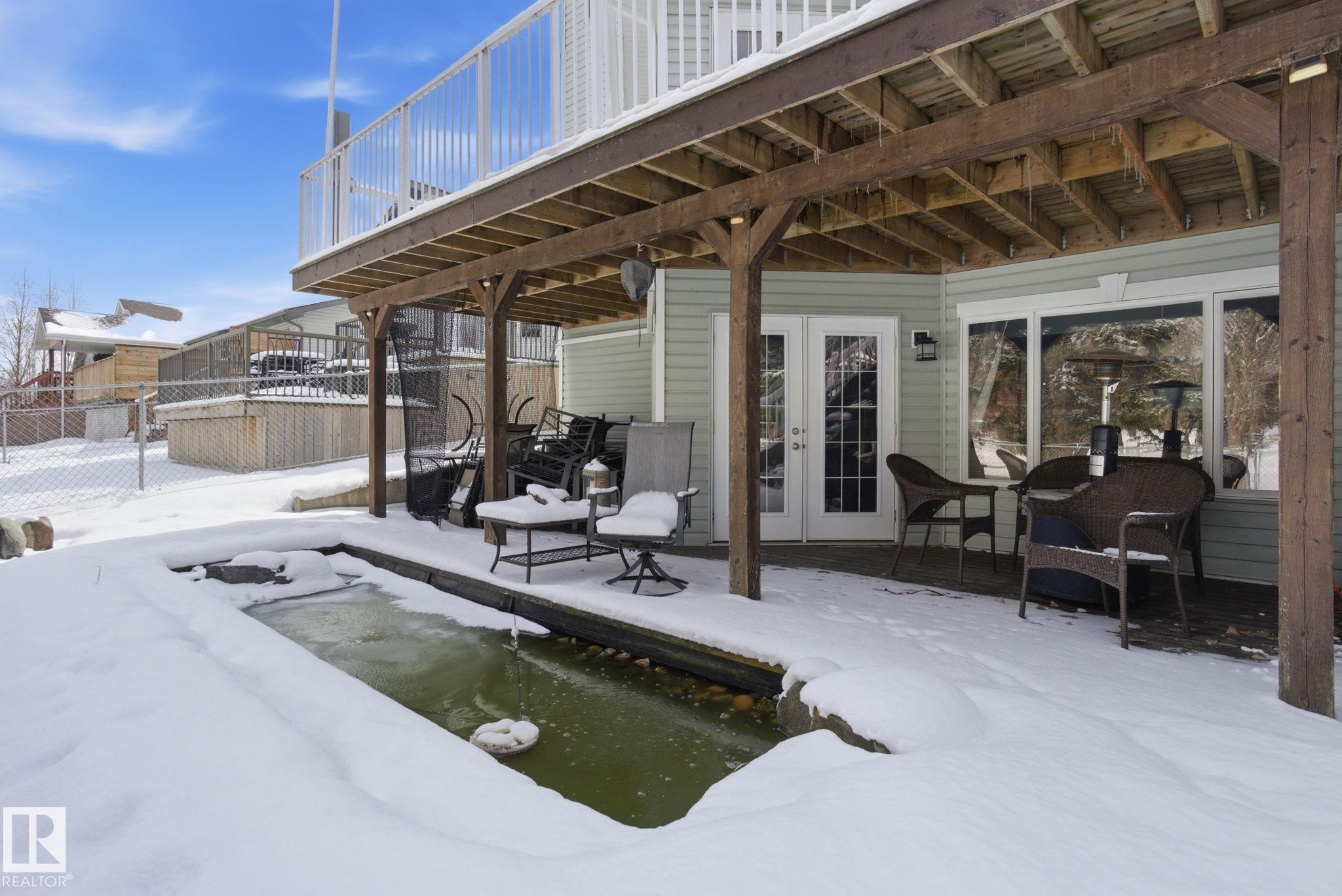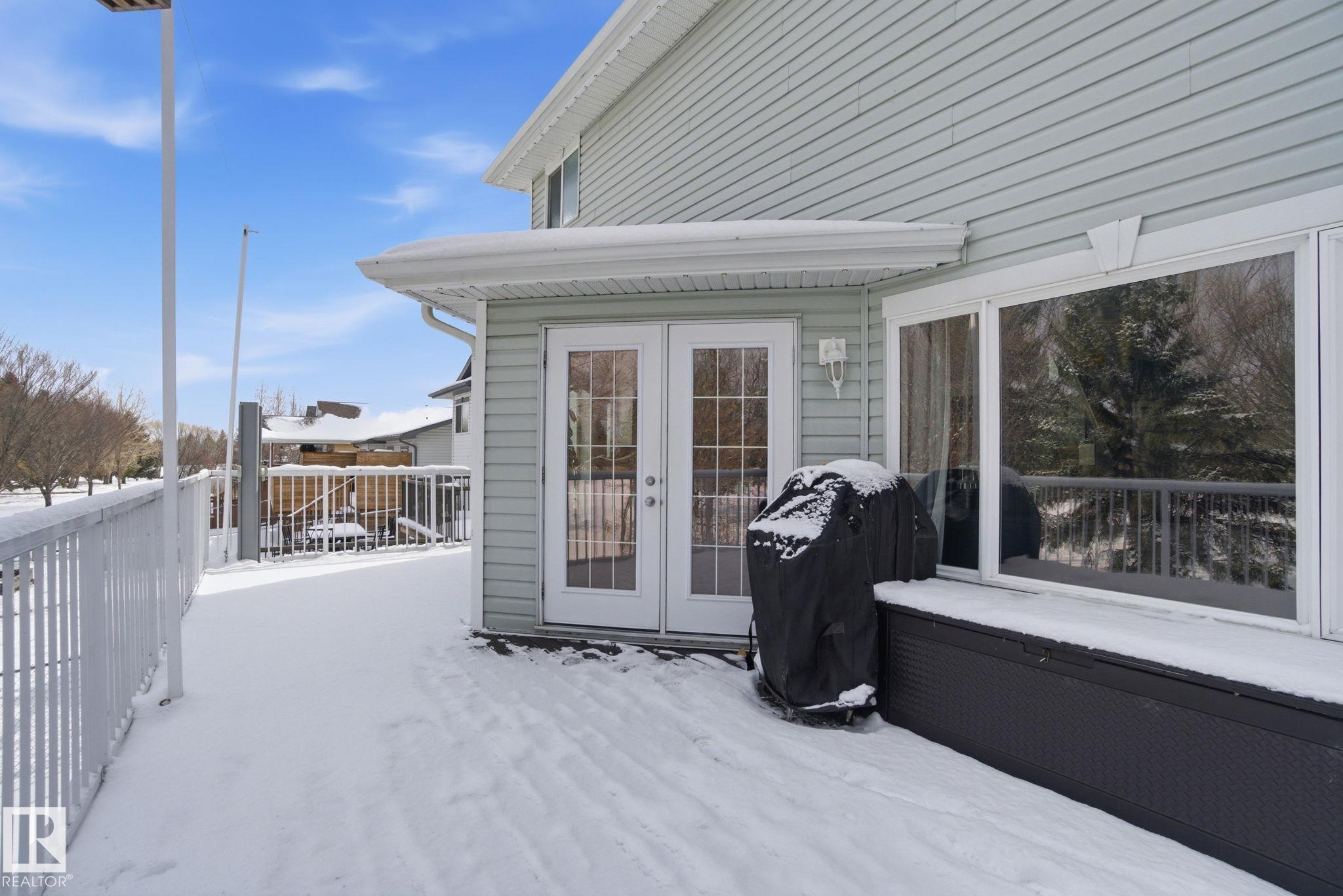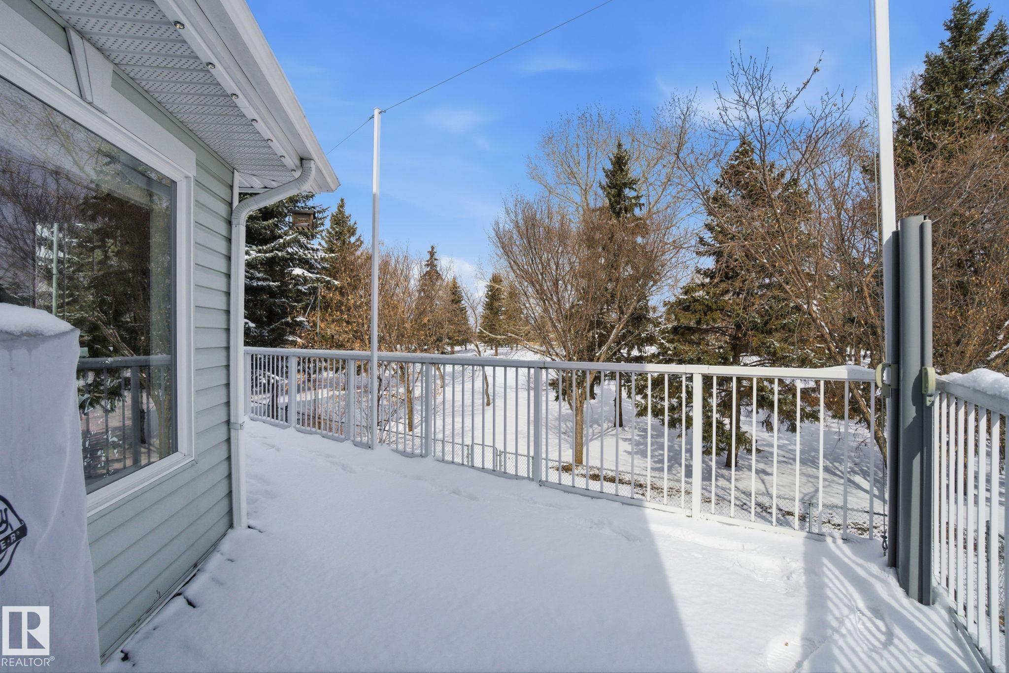 Beautiful WALKOUT 2-storey BACKING the GOLF COURSE in Stony Plain! Over 1500 sq ft PLUS fully finished basement. 18' ceilings greet you as you enter. Front flex room could be a great dining space, home office or formal living room. NEW kitchen is gorgeous with beautiful white cabinets, quartz countertops, corner pantry & updated appliances! Great breakfast nook with room to expand for guests! Large living room for more entertaining with gas fireplace. Tons of natural light through the windows looking onto the mature trees of the golf course. MAIN FLOOR LAUNDRY! Upstairs the master suite is a great size with large walk in closet and newly renovated 4pc ensuite. 2 more bedrooms are great for kids, guests or a home office. Walkout basement has large rec room space. It's even fully plumbed for wet bar or future 2nd kitchen. Another bedroom & 4pc bath. Large deck is great to spend a warm summer evening & yard is fully landscaped including picture, perfect Koi pond. It's your own private oasis!!!