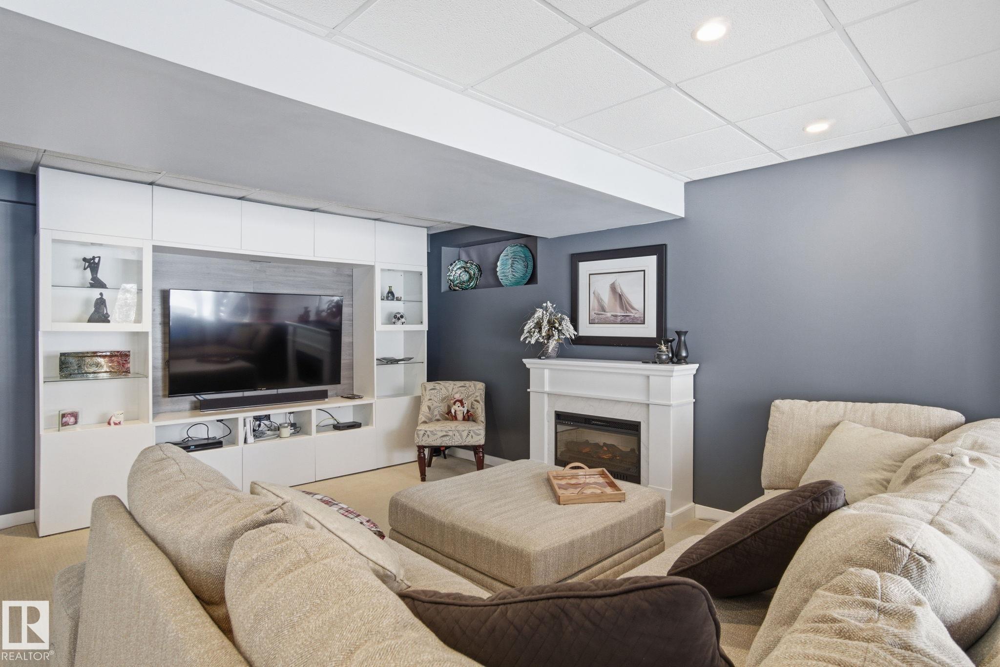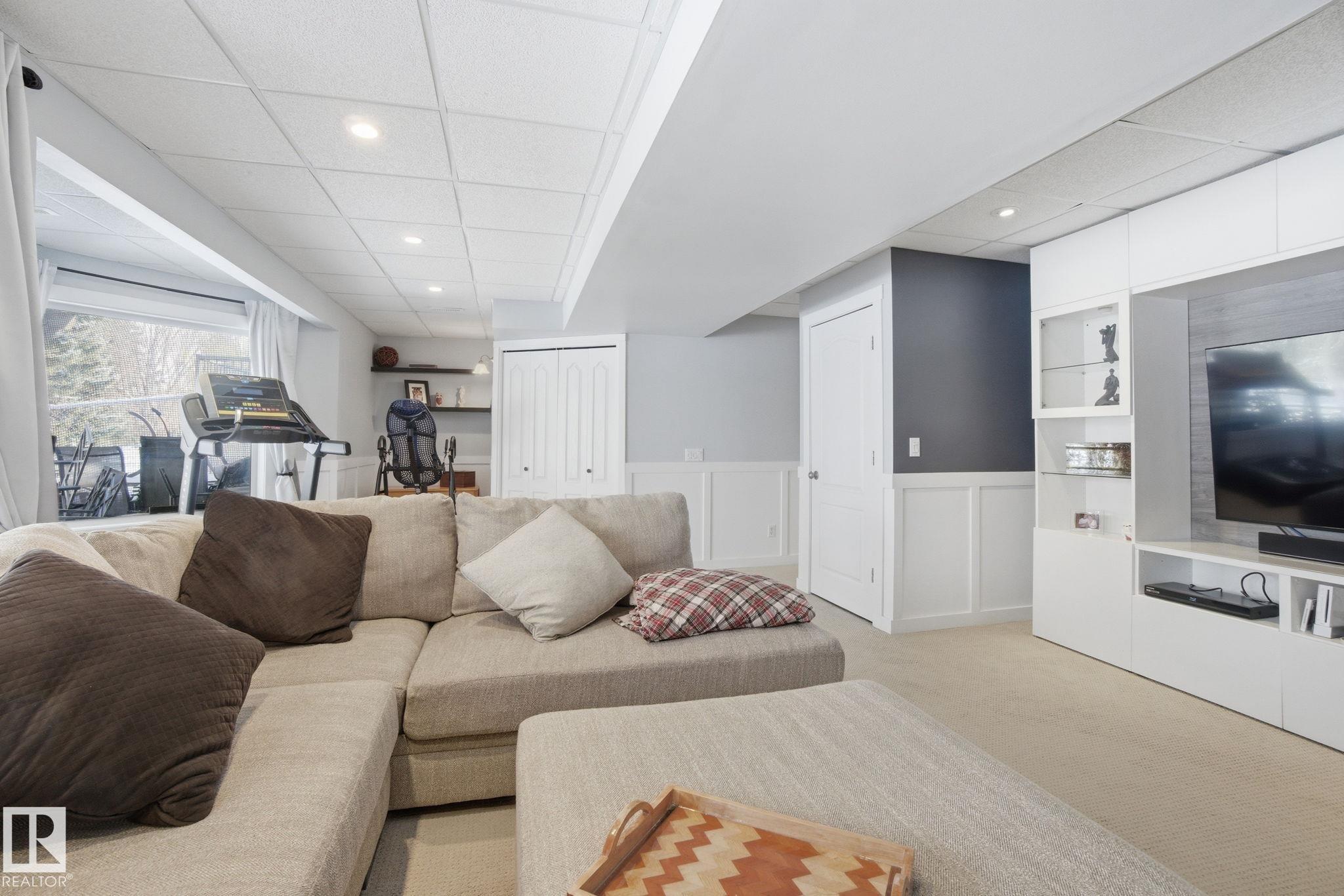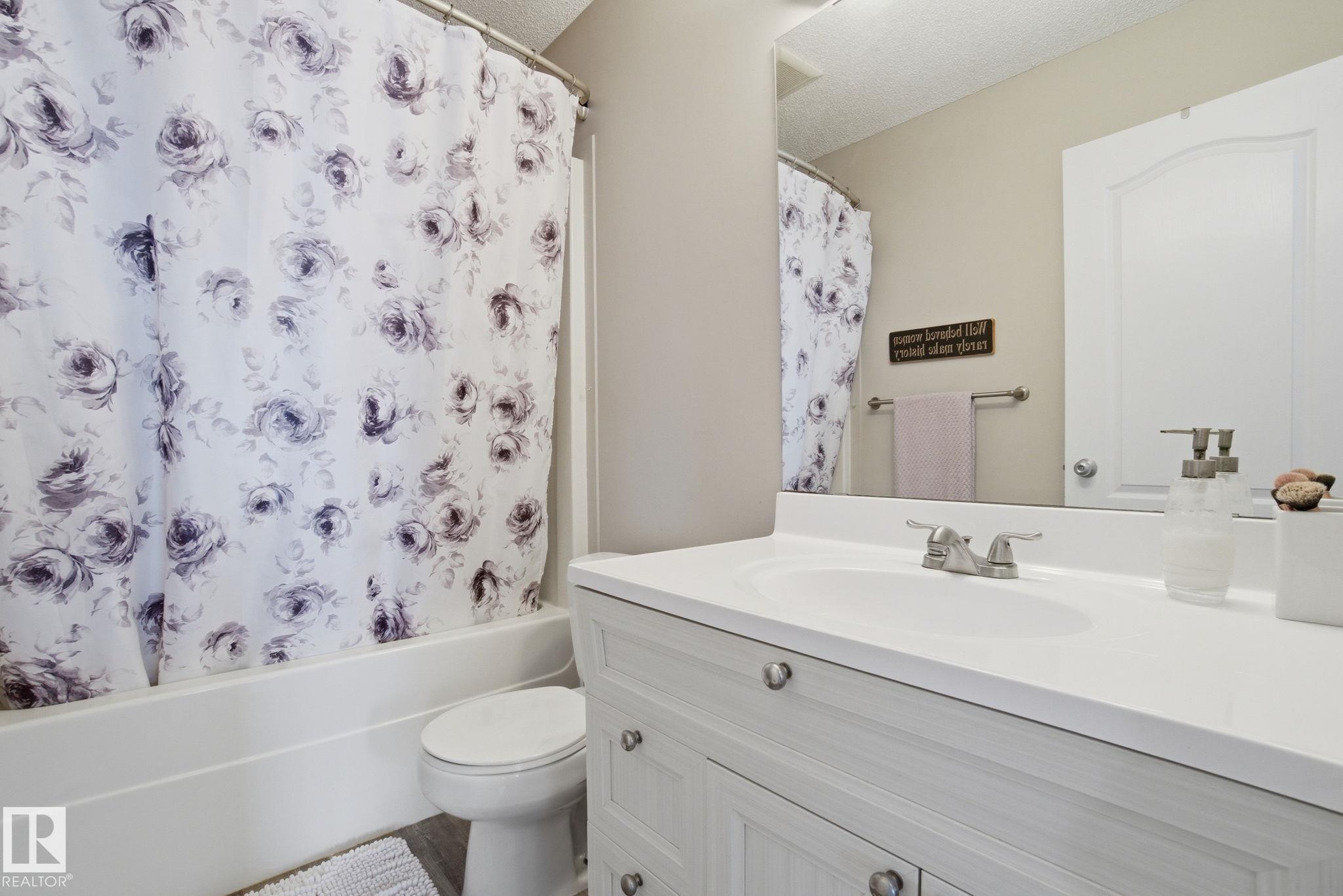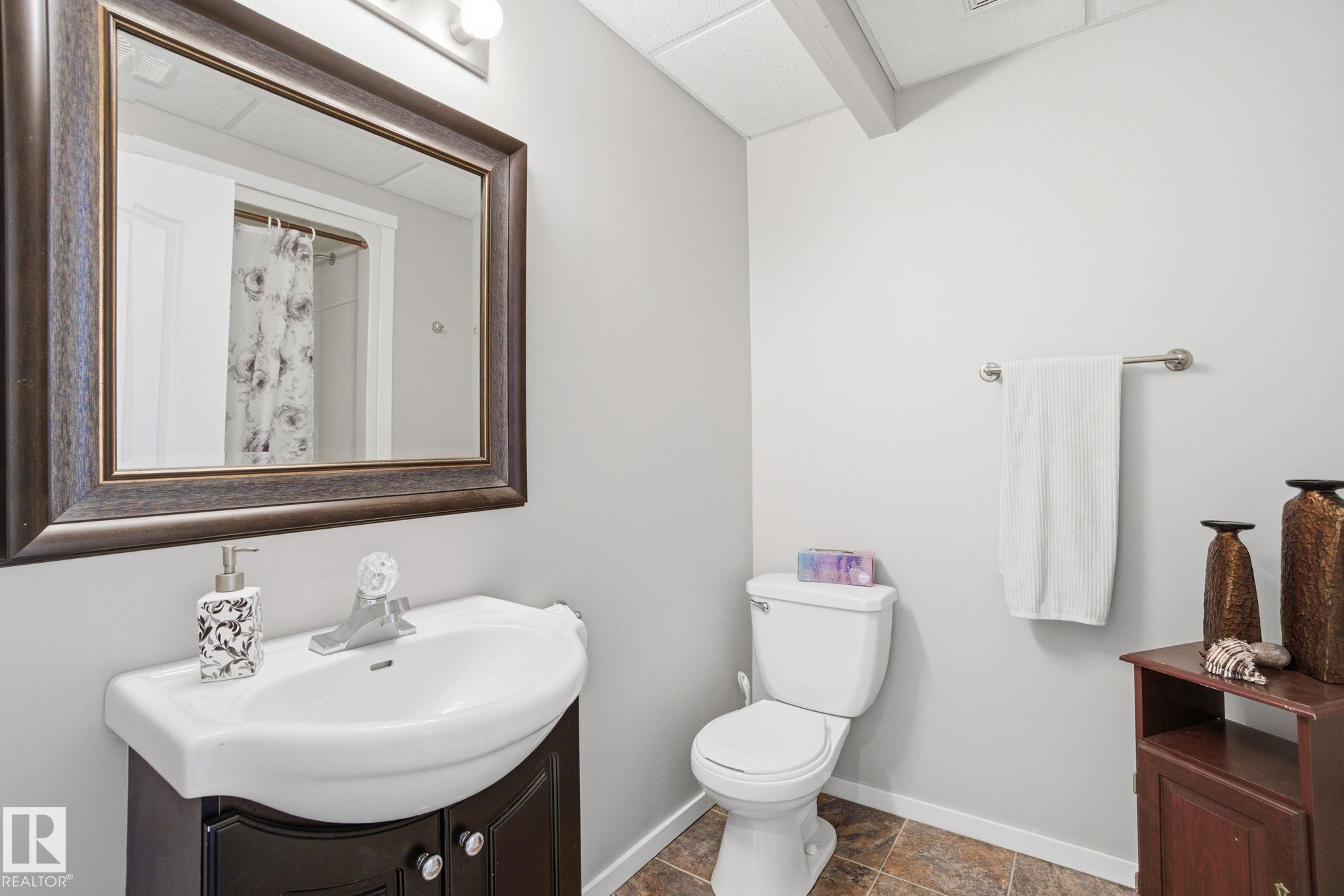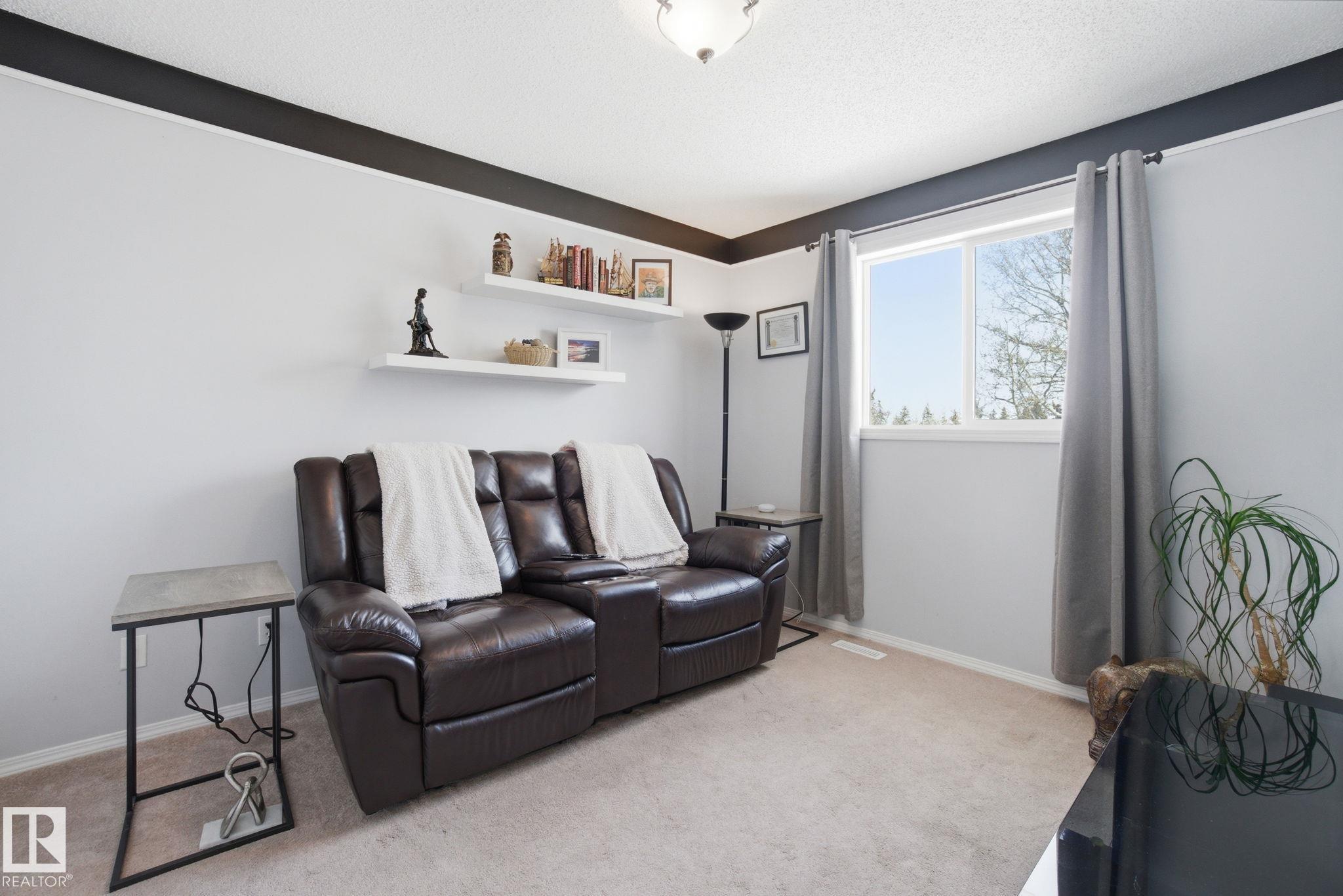 Beautiful WALKOUT 2-storey BACKING the GOLF COURSE in Stony Plain! Over 1500 sq ft PLUS fully finished basement. 18' ceilings greet you as you enter. Front flex room could be a great dining space, home office or formal living room. NEW kitchen is gorgeous with beautiful white cabinets, quartz countertops, corner pantry & updated appliances! Great breakfast nook with room to expand for guests! Large living room for more entertaining with gas fireplace. Tons of natural light through the windows looking onto the mature trees of the golf course. MAIN FLOOR LAUNDRY! Upstairs the master suite is a great size with large walk in closet and newly renovated 4pc ensuite. 2 more bedrooms are great for kids, guests or a home office. Walkout basement has large rec room space. It's even fully plumbed for wet bar or future 2nd kitchen. Another bedroom & 4pc bath. Large deck is great to spend a warm summer evening & yard is fully landscaped including picture, perfect Koi pond. It's your own private oasis!!!