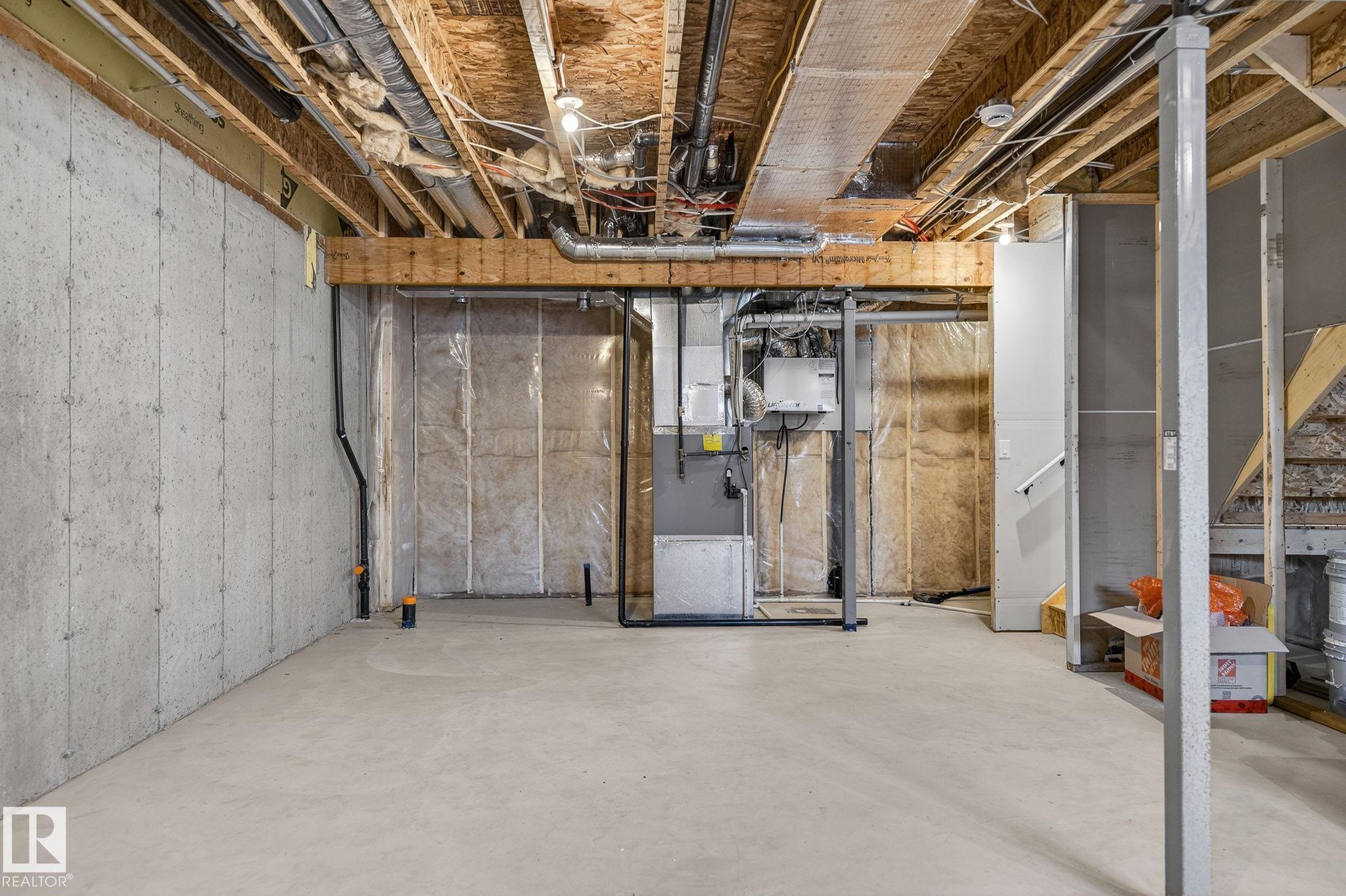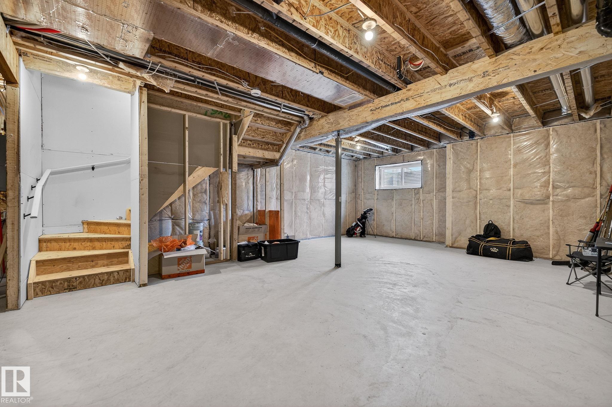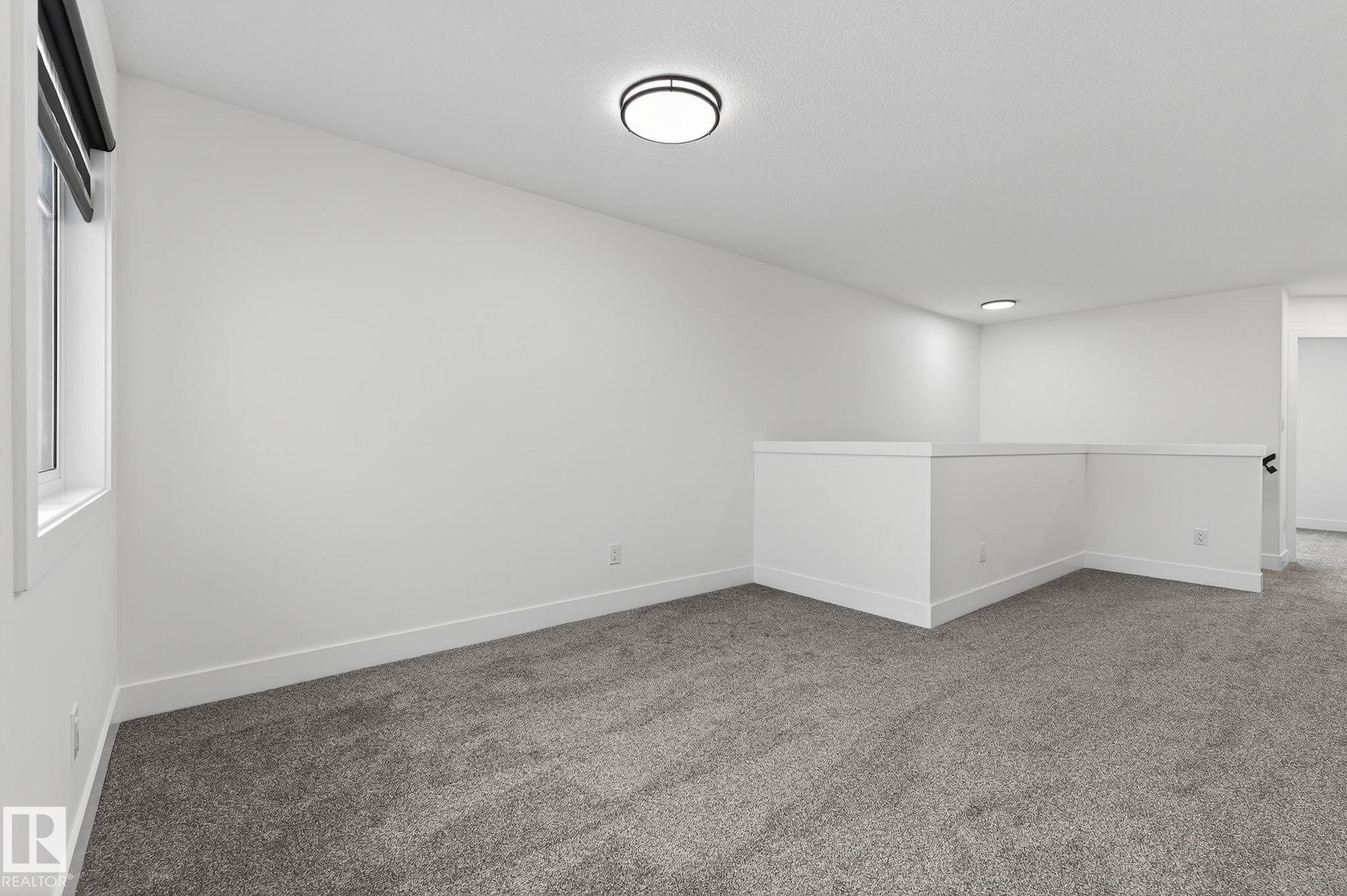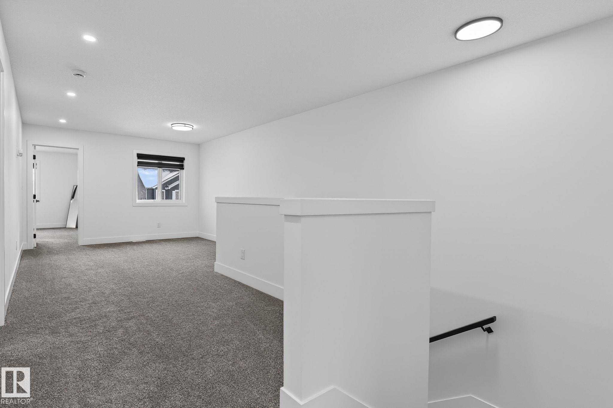 Welcome to this beautiful half duplex in Harvest Ridge, perfectly positioned backing onto mature trees. The main floor is thoughtfully designed with a bright, open-concept filled with natural light, which makes an immediate impression with its modern floor-to-ceiling feature wall and sleek electric fireplace. The kitchen is beautifully appointed with quartz countertops, soft-close cabinetry, and a walk-through pantry. Upstairs, a spacious bonus room offers flexible living space, while the primary suite offers a 4-piece ensuite and a generous walk-in closet that conveniently connects to the laundry room. Two additional bedrooms and a second 4-piece bath complete this level. Thoughtfully designed with MDF shelving throughout every closet, pantry, and mudroom, plus upgrades like a garage drain and BBQ gas line, blending style with function. A fully fenced backyard and an unfinished basement with a side entrance offer incredible future potential. This home is move-in ready and beautifully finished!