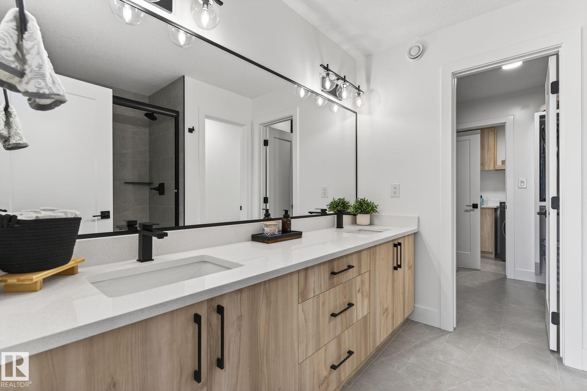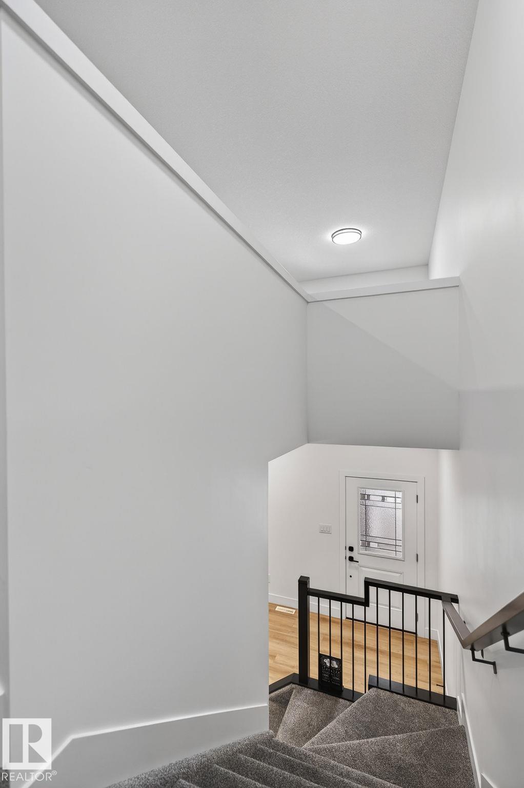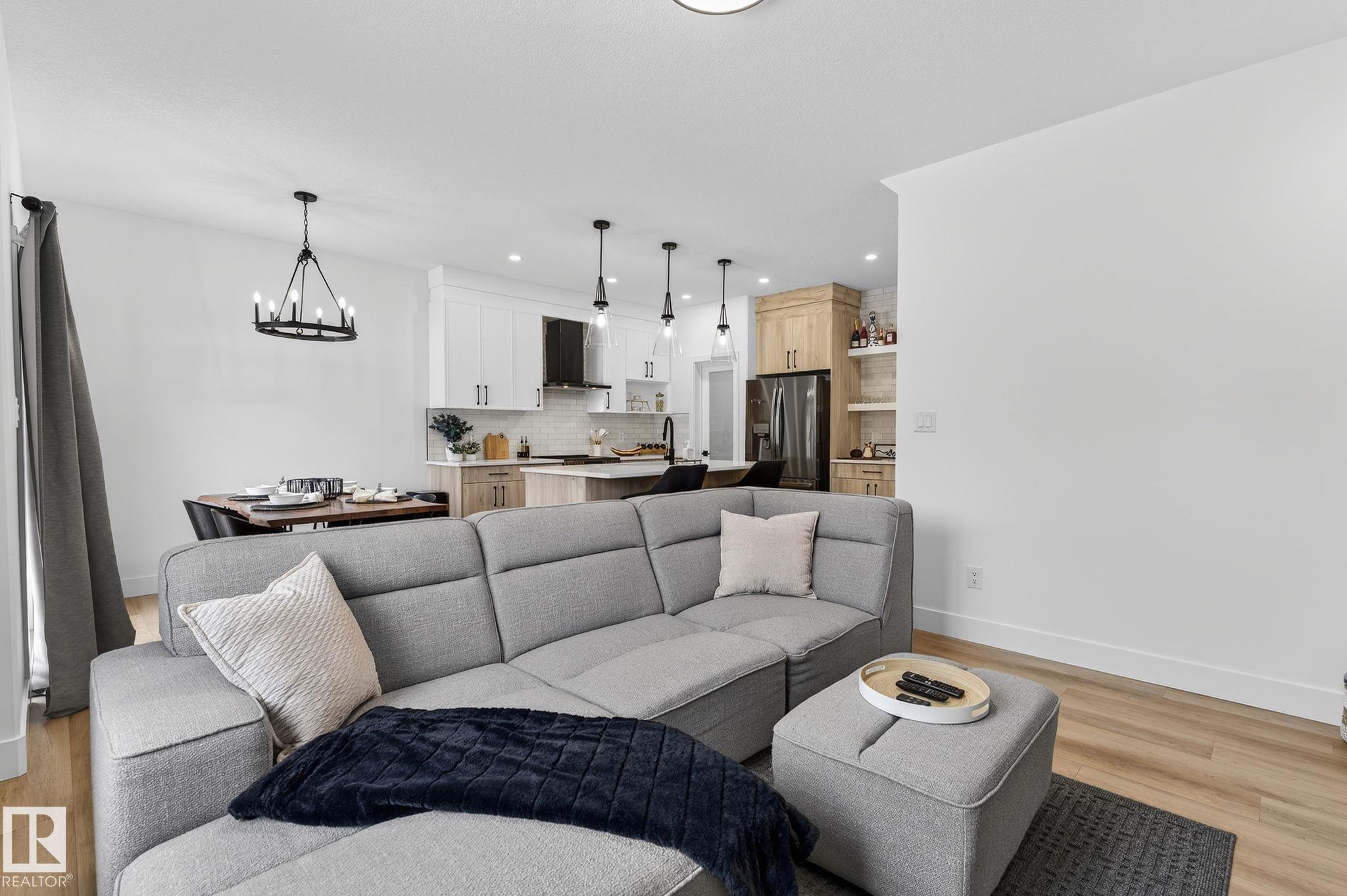 Welcome to this beautiful half duplex in Harvest Ridge, perfectly positioned backing onto mature trees. The main floor is thoughtfully designed with a bright, open-concept filled with natural light, which makes an immediate impression with its modern floor-to-ceiling feature wall and sleek electric fireplace. The kitchen is beautifully appointed with quartz countertops, soft-close cabinetry, and a walk-through pantry. Upstairs, a spacious bonus room offers flexible living space, while the primary suite offers a 4-piece ensuite and a generous walk-in closet that conveniently connects to the laundry room. Two additional bedrooms and a second 4-piece bath complete this level. Thoughtfully designed with MDF shelving throughout every closet, pantry, and mudroom, plus upgrades like a garage drain and BBQ gas line, blending style with function. A fully fenced backyard and an unfinished basement with a side entrance offer incredible future potential. This home is move-in ready and beautifully finished!