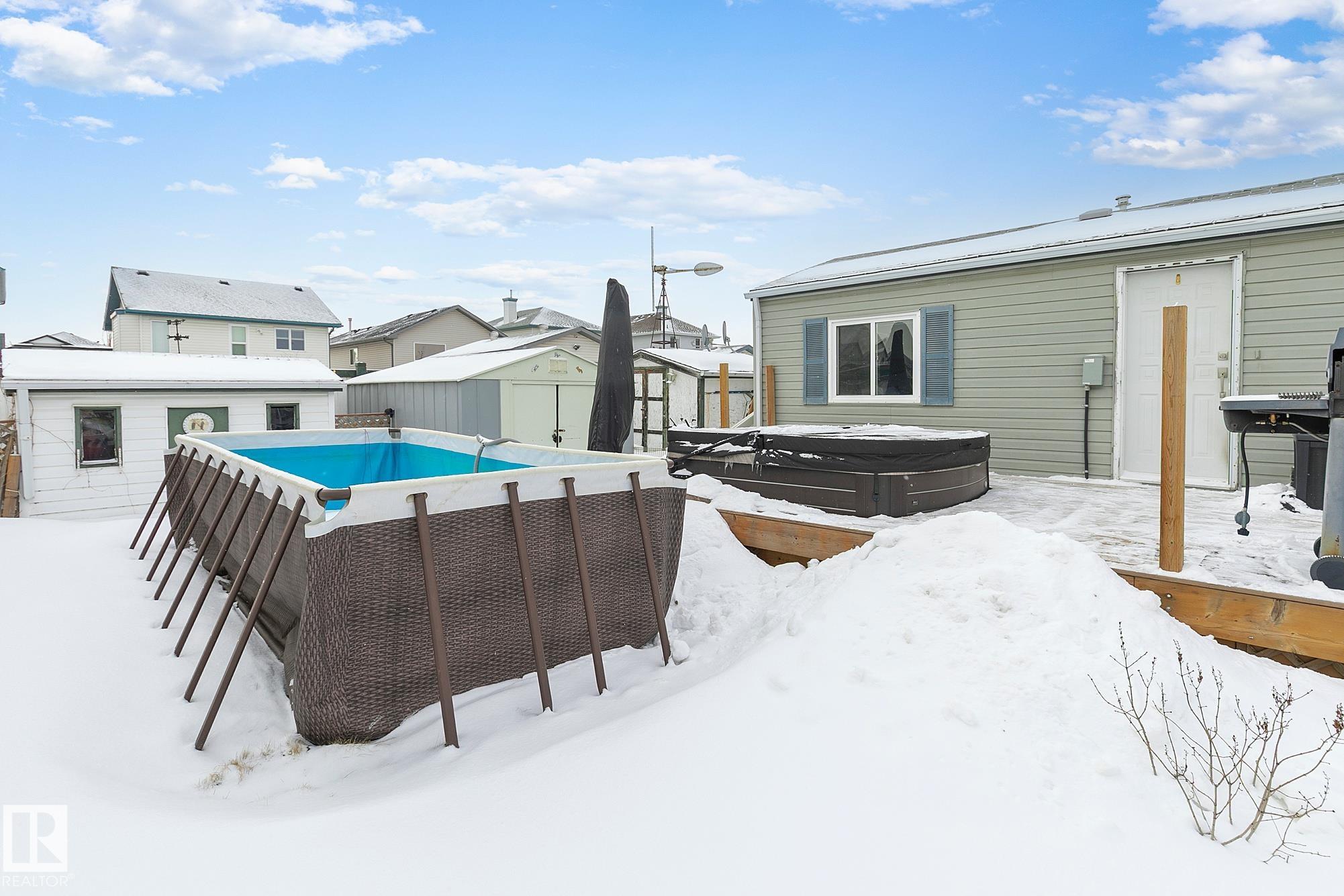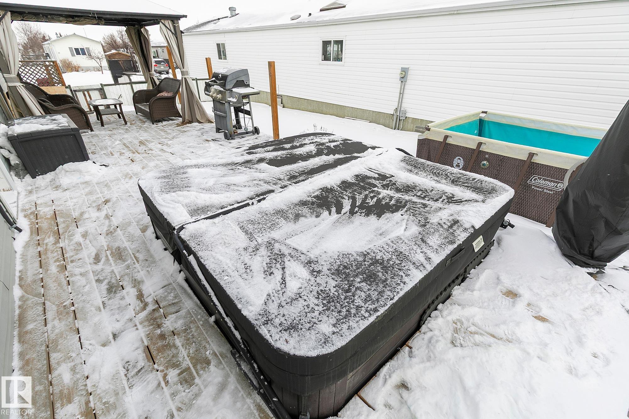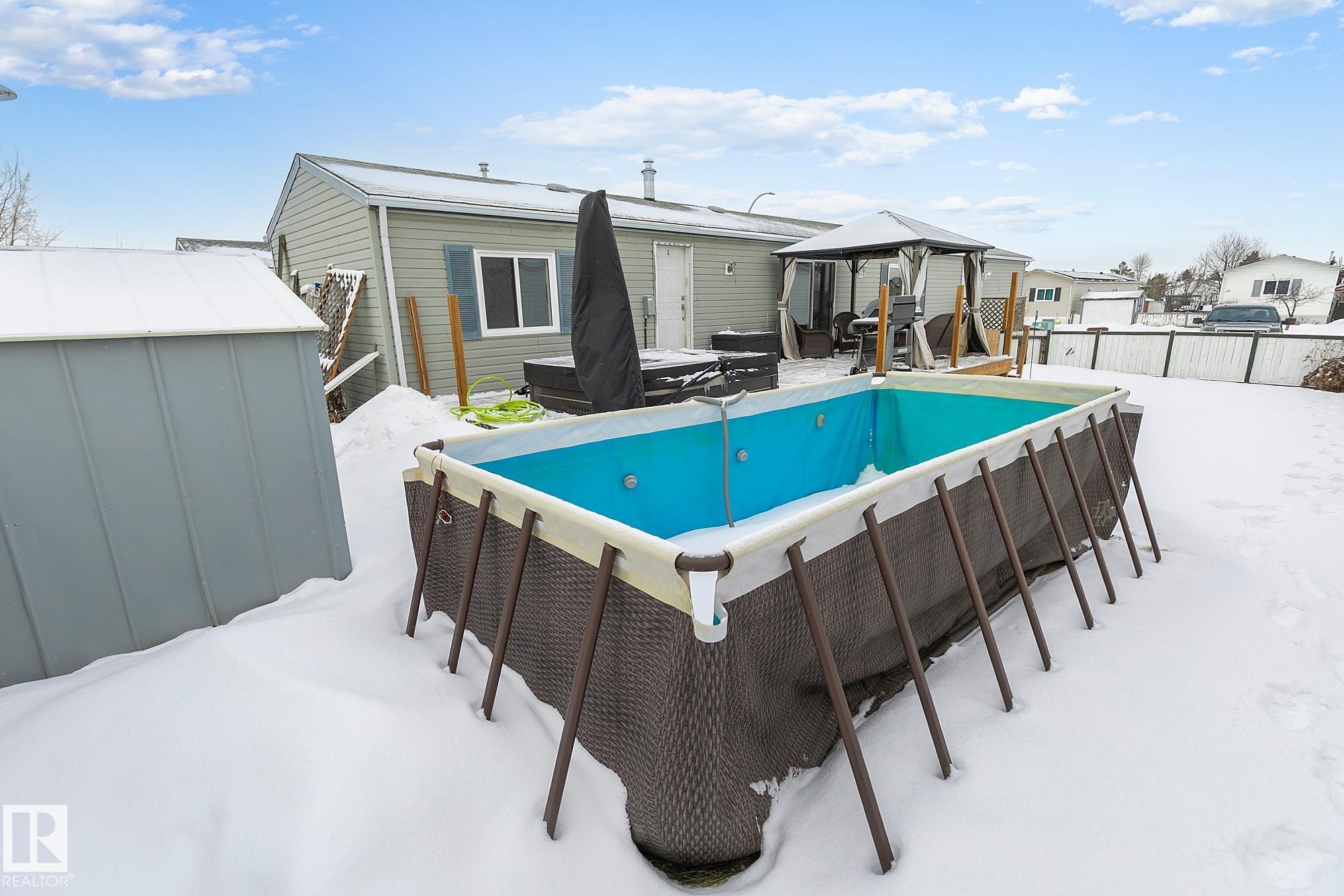 RUN...don't walk to this fantastic 3 bed, 2 bath home on titled land! Perfect for first-time buyers or downsizers, to own your land and home. Stop renting. Enjoy the bright, open-concept layout with large windows, a spacious living area, and great entertaining flow. The primary bedroom offers a 4-pc ensuite, while the 2 additional bedrooms sit at the opposite end for added privacy. Relax on your new deck, sit back and enjoy the pool & hottub. Newer furnace, hot water tank, countertops, and flooring; brand-new shingles on Monday! Bonus features include a heated aboveground pool with a new pump and heater, a 6 person hot tub, a gazebo, 3 sheds, 220 volt wiring in one patio furniture set, and a mostly furnished interior. Walk to amenities with easy transit access. Act fast, affordability is rare; it's your prime opportunity to own your own home and land.